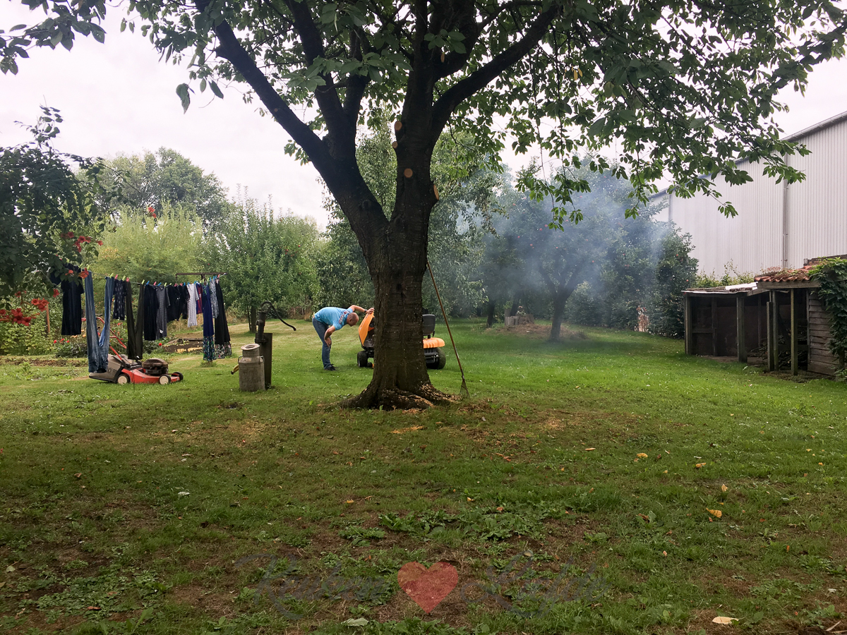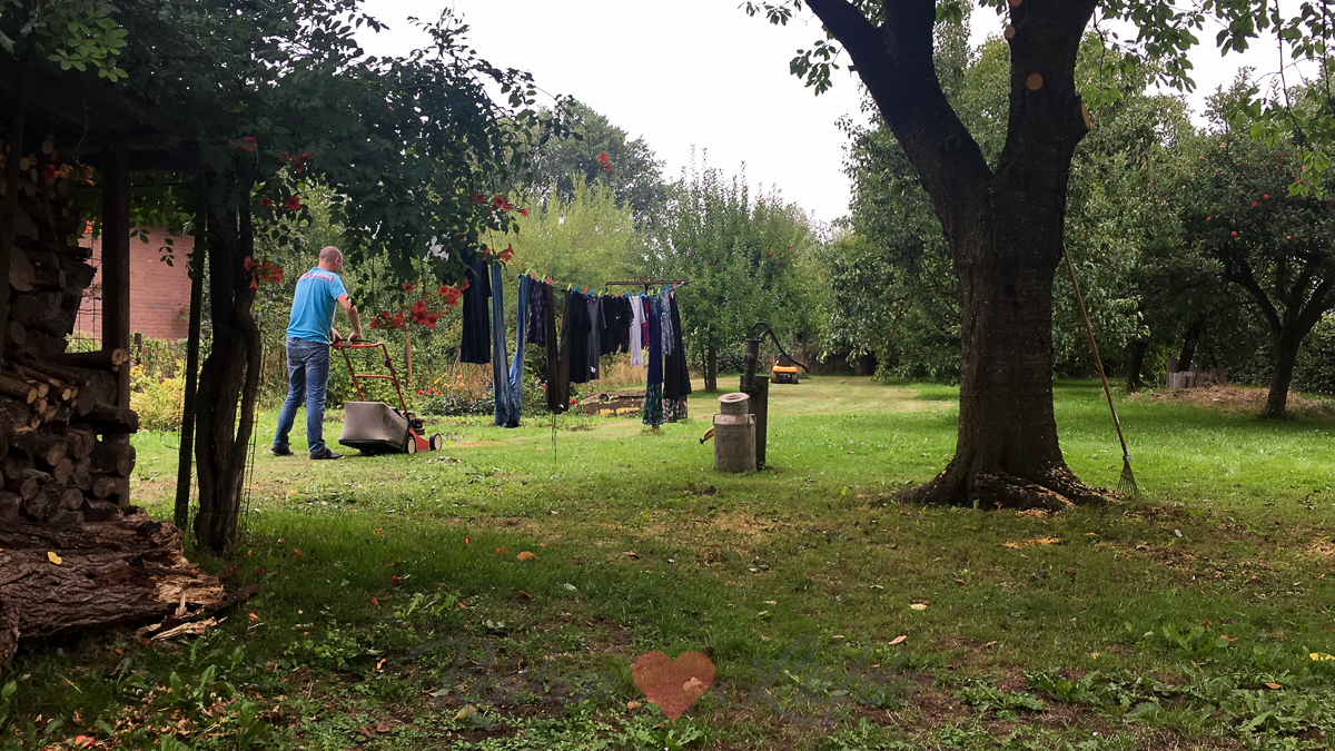 Na vijf minuten maaien hoor ik een knal en zie ik een grijze rookpluim. De maaier heeft het begeven. Gelukkig hebben we de handmaaier nog…. Het landleven gaat niet alleen over rozen.