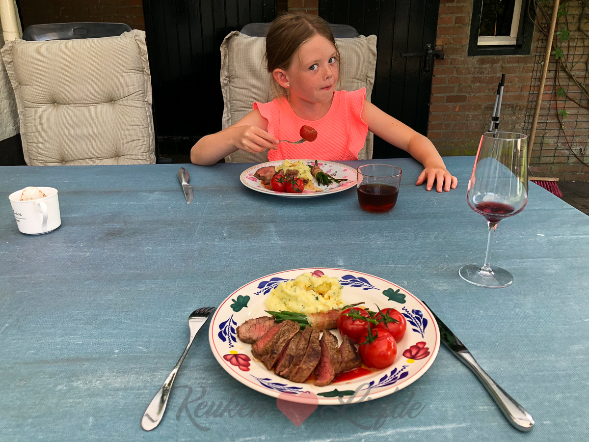 Het normale leven begint langzaamaan weer vorm te krijgen. Hier in Dreumel begint de school weer en Ella-Marie heeft dus haar eerste schooldag in een nieuwe klas. Johan heeft deze week nog vakantie en we hebben de hele week vrijgepland om dozen uit te pakken en klusjes te doen. Ella-Marie mag kiezen wat ze vandaag wilt eten en daar hoeft ze niet lang over na te denken. Biefstuk met puree! (Dit recept.) Erbij maak ik haricots verts rolletjes met spek en gepofte trostomaten uit de oven.
