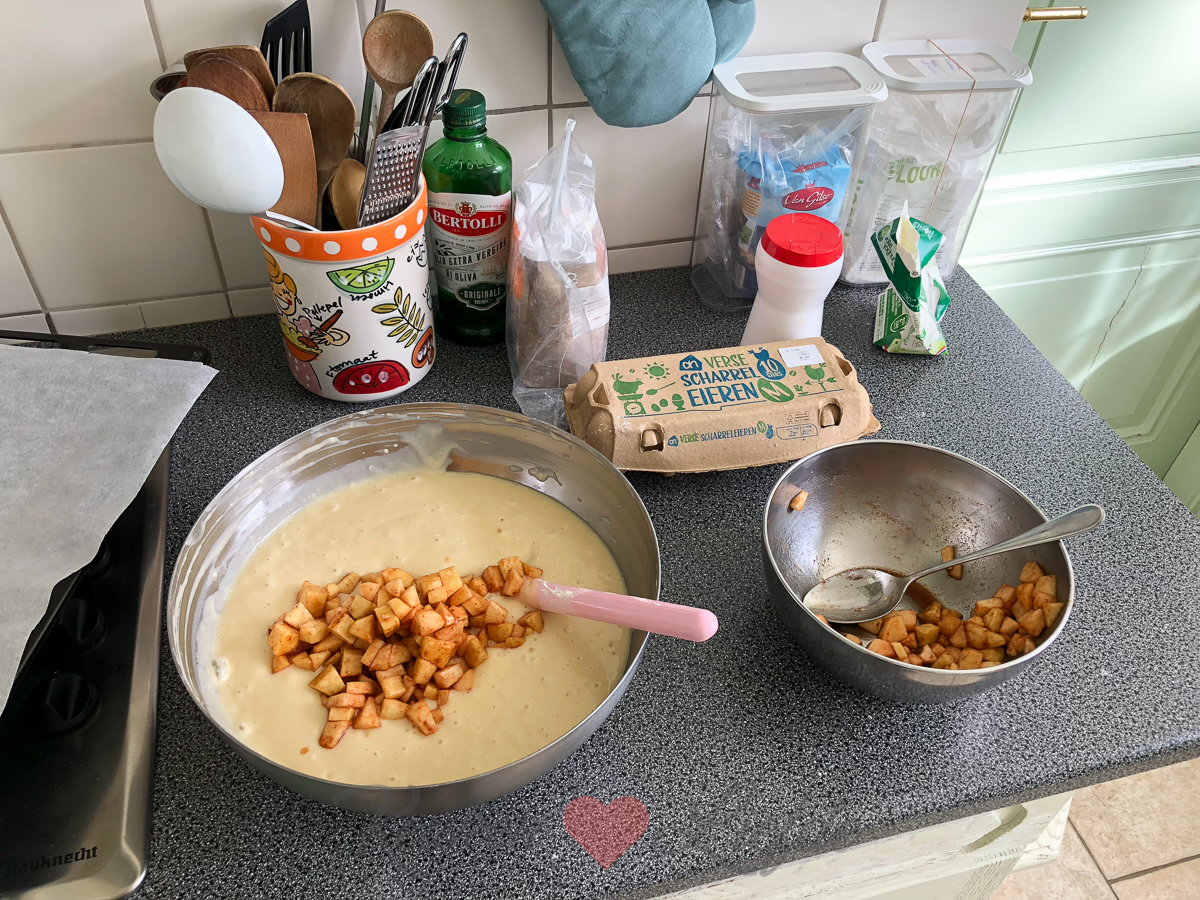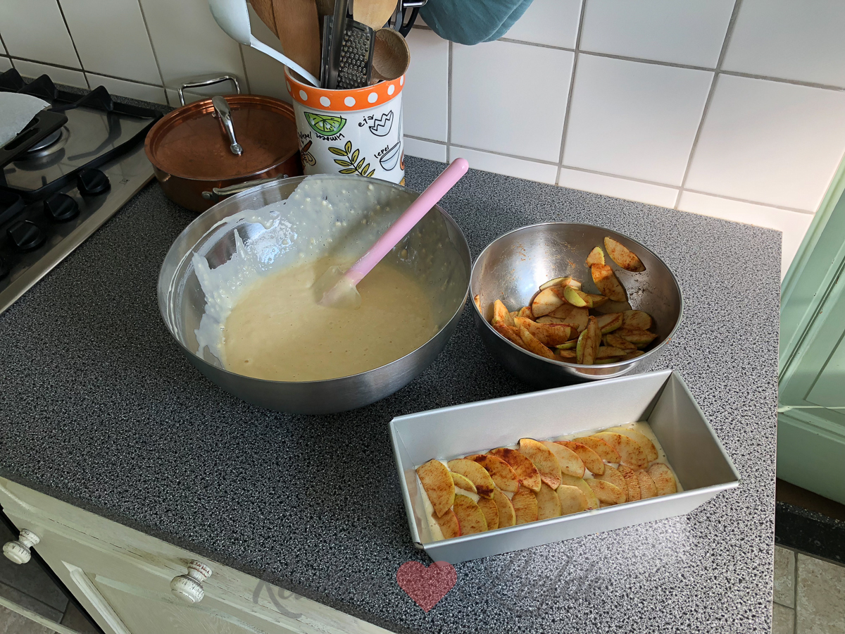 Ik bak ’s ochtends nog twee yoghurtcakes met appel (dezelfde die ik eerder deze week maakte) die ik naar de buren breng. We hadden nog niet echt kennis gemaakt dus hopelijk vallen we hiermee direct in goede aarde… 😉