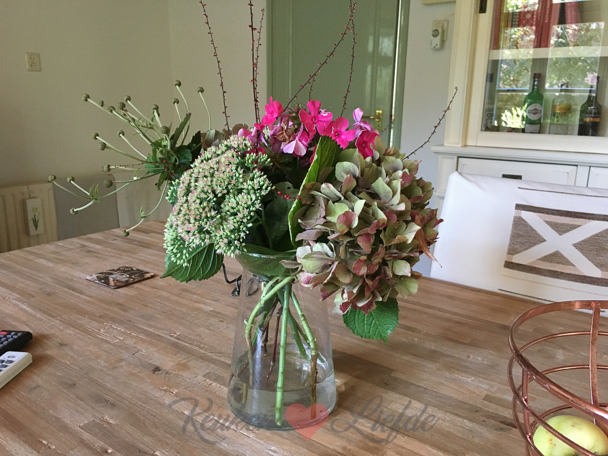 Johan en Ella-Marie zijn ’s ochtends al vroeg weg want Ella heeft een voetbaltoernooi met haar team. Ik rommel thuis een beetje aan en maak boeketjes bloemen voor in huis met bloemen uit onze voortuin.