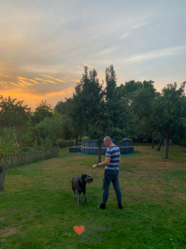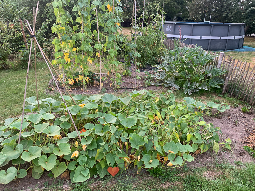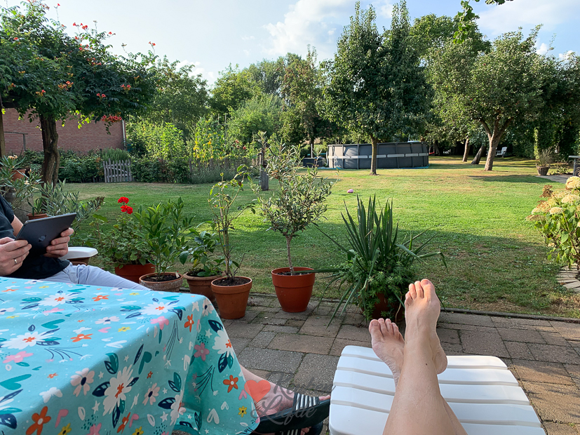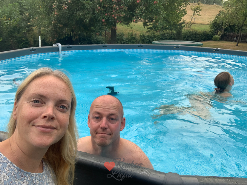 Johan zijn tweede werkdag na de vakantie zit er alweer op. Ondanks dat zijn zomervakantie erop zit gaan de zomerse temperaturen gewoon door. Als hij thuiskomt neemt hij samen met Ella een verfrissende plons in het zwembad. Ondertussen rommel ik een beetje in de moestuin. Want ook daar groeit alles gestaag verder. Ik hoef geen eten te koken want er is nog nasi goreng van gisteren over. Die wordt even opnieuw opgebakken met erbij weer een gebakken ei en mini loempia. Smullen. Het is een prachtige zomeravond en we blijven buiten tot het donker wordt.
