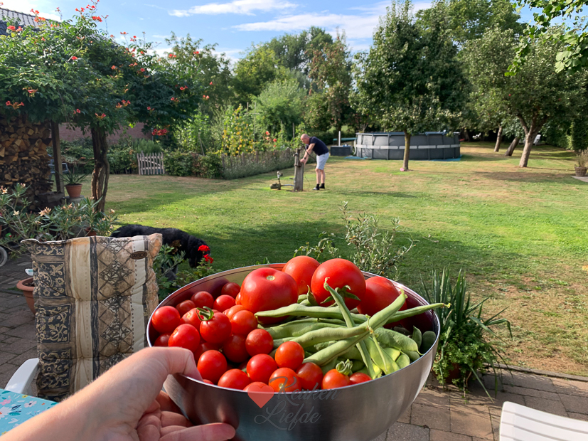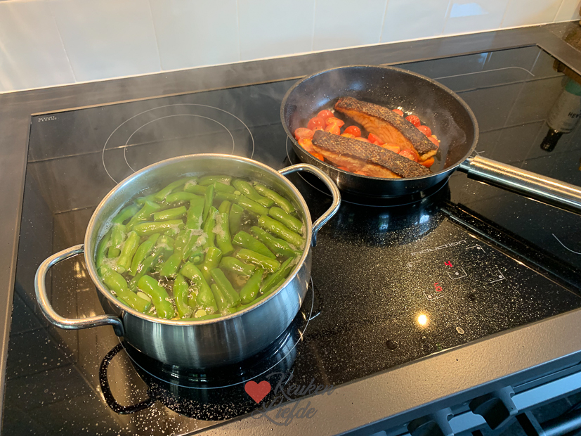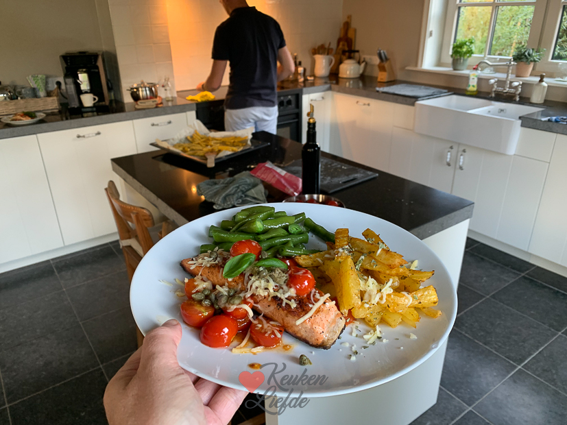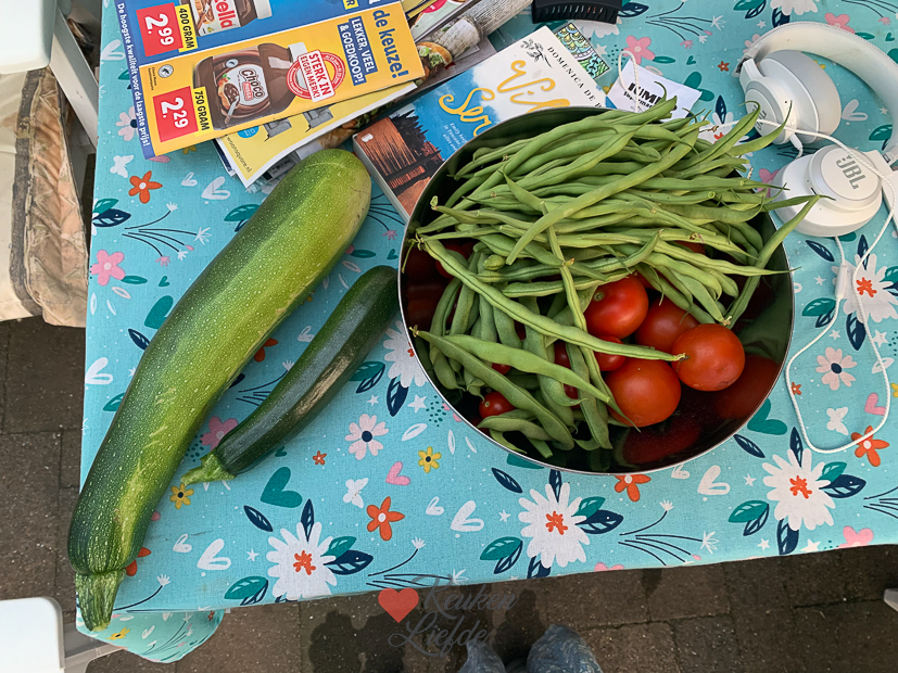 Johan is ’s ochtends alweer vroeg de deur uit voor zijn werk en ik heb (Ella is nog bij opa en oma) het rijk sinds lange tijd weer eens voor mezelf alleen. Zalig! Ik werk de hele dag op kantoor en bedenk en schrijf onder andere weer nieuwe recepten uit voor een kookdag binnenkort. Iets met tomaten en sperziebonen…. Die dingen blijven maar groeien! ’s Avonds eten we gekookte sperziebonen met zelfgeschilde frietjes van het bakblik en gebakken zalm met knoflook, tomaat en kappertjes. En ja, een klein beetje kaas.
