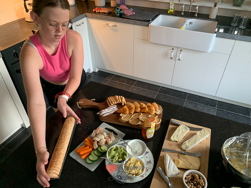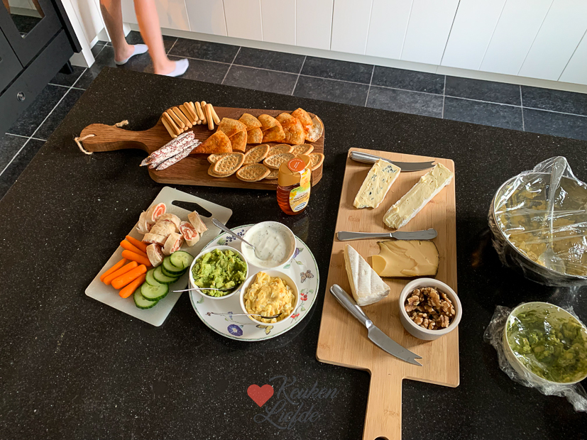 Ella en ik halen ’s middags de boodschappen die ze nodig heeft voor het borrelplankje. Eenmaal thuis gaat ze aan de slag. Ze maakt wraps met zalm en roomkaas, krokante tortillachips met een frisse yoghurtsaus, eiersalade en guacamole. En verder had ze verschillende kaasjes, chorizoworstjes, toastjes en rauwkost. Ik heb niks hoeven/mogen doen, behalve de afwas. 😉 Wat een topper! We genoten van het borrelplankje terwijl we de nieuwe film Uncharted keken. Aanrader. Zowel het borrelplankje als de film.