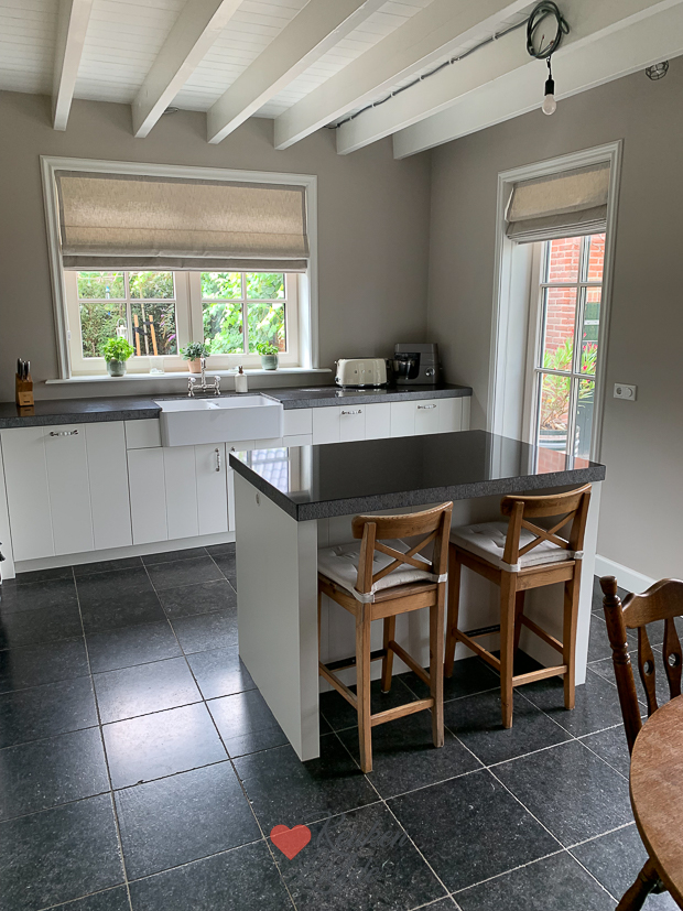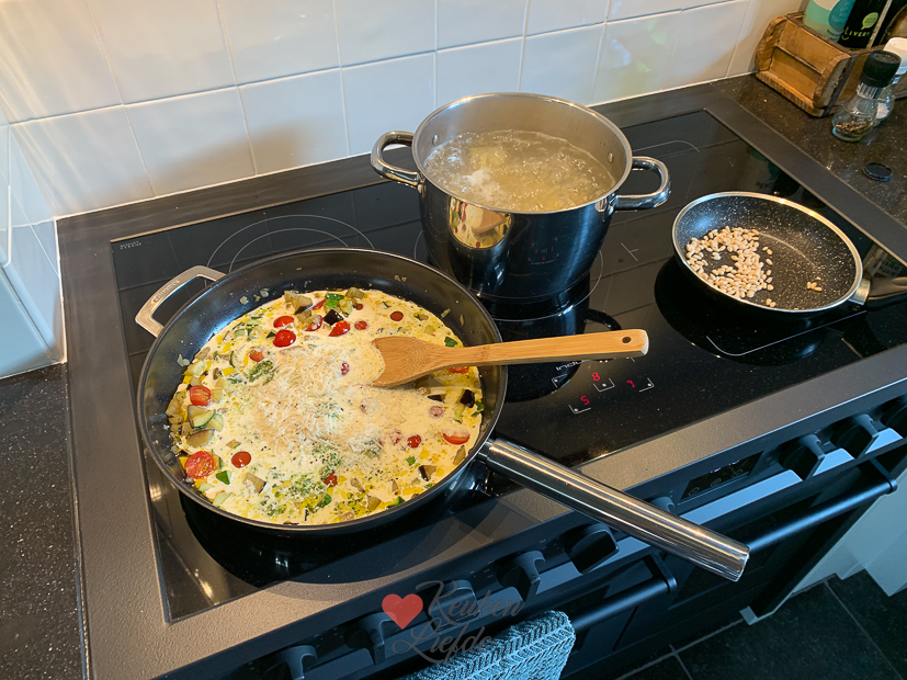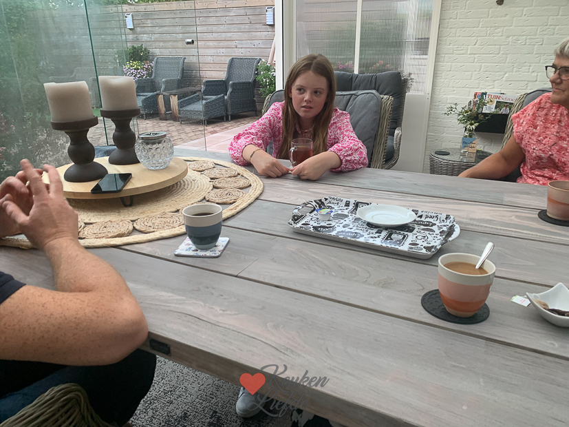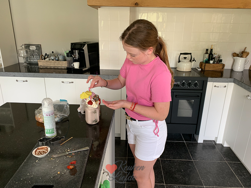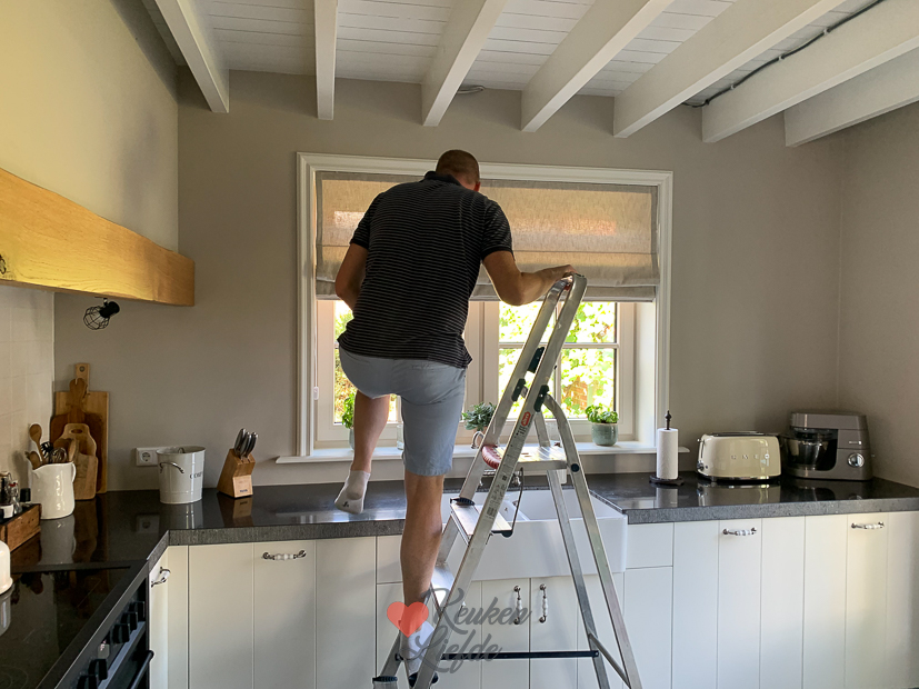 Johan gaat ’s ochtends aan de slag om gordijnen in de keuken op te hangen van Veneta (samenwerking). Na het kijken van een montagefilmpje op hun website gaat hij aan de slag. Niet veel later hangen de vouwgordijnen en gordijnen alsof ze er al jaren hangen. We kozen voor de stof Delight Greige. Deze stof is semi-transparant en heeft een natuurlijke uitstraling. We zijn er heel blij mee. ’s Middags gingen we nog even kijken bij de Vuelta die langs ons dorp reed. Heel gaaf om te zien! Weer thuis maakte mini me een freak shake en rommelden Johan en ik binnen en buiten wat aan. ’s Avonds maakte ik pasta pesto met aubergine, courgette en tomaatjes.