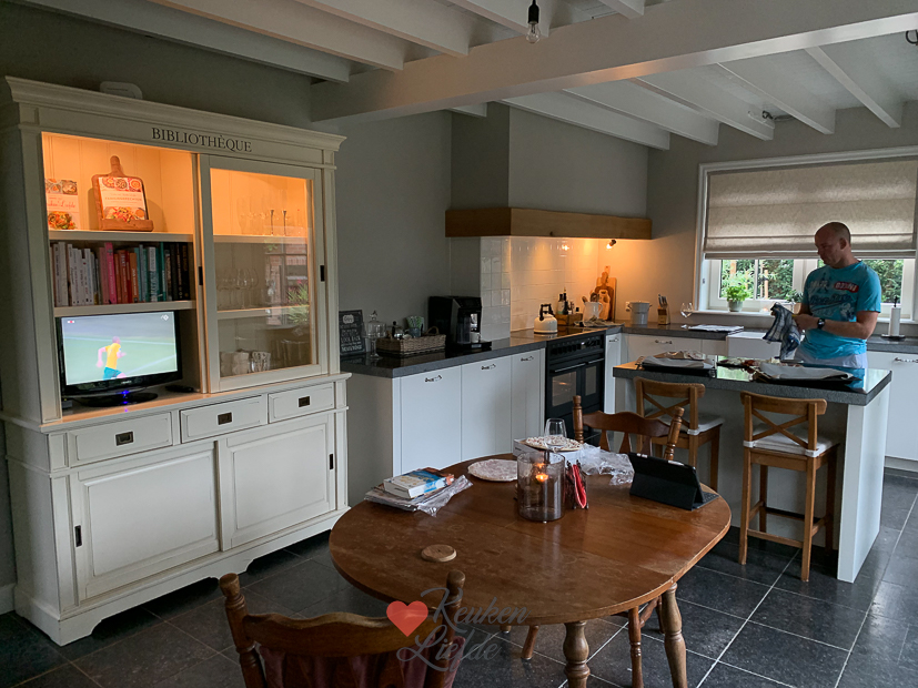 De kast eruit. Hij staat erbij alsof hij er staat omdat je hem toch had en een plekje zocht… “plaatsen om het plaatsen”. Zonde van de mooie kast én van de prachtige keuken. Beiden mooi, maar niet samen. Maar dat is mijn mening. En smaken verschillen en het is júllie huis. Maar ja, je vroeg wat ‘wij’ ervan dachten. Dit dus.