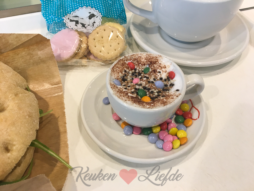 Op woensdag is Ella-Marie om kwart over twaalf uit school en gaan we samen lunchen. Op verzoek van Ella strijken we neer bij de Hema in Tiel. Ella-Marie neemt een broodje hotdog en een kindercappuccino en ik neem een broodje met roomkaas en een grote-mensen-cappuccino. 🙂