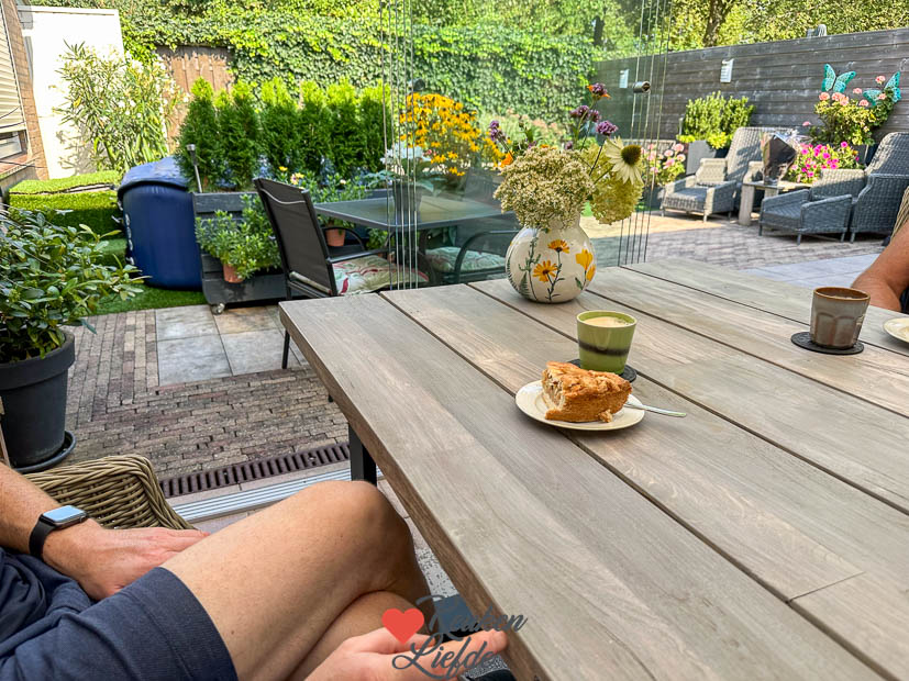 We slapen lekker uit en stropen daarna onze mouwen op. Johan gaat buiten aan de slag om het zwembad op te ruimen en het gras te maaien en ik maak binnen het huis aan kant. Ik zet Ella-Marie ’s begin van de middag af in Druten waar ze met een vriendin de bus pakt naar Nijmegen om te shoppen. ’s Avonds haal ik ze weer op in Druten.