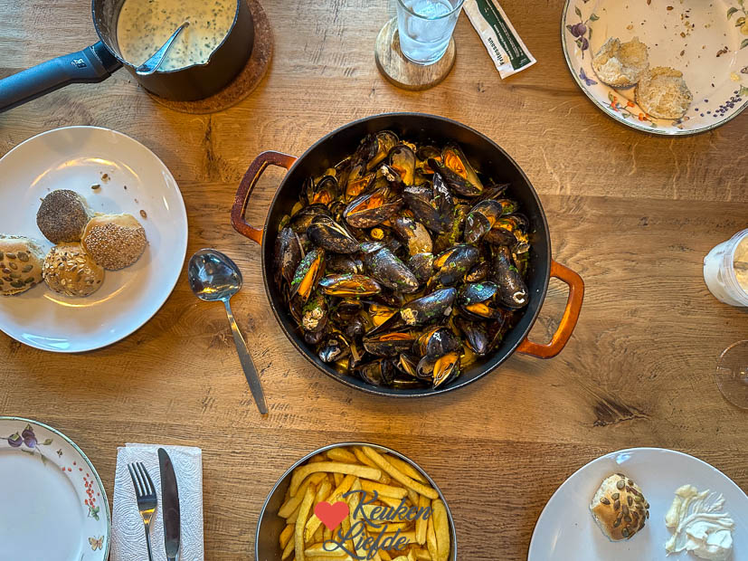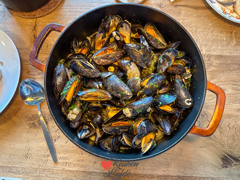 ’s Avonds steekt Johan het ei aan om mosselen te bereiden. Die eten we met roquefortsaus, stokbrood en frietjes. In 2017 maakten we dit kookfilmpje van de bereiding maar inmiddels maken we roquefortsaus niet meer met het kookvocht van de mosselen maar verwarmen we slagroom in een pannetje en roeren daar naar smaak roquefort doorheen. Meer is het niet! Lekker over de mosselen maar ook lekker als pastasaus.