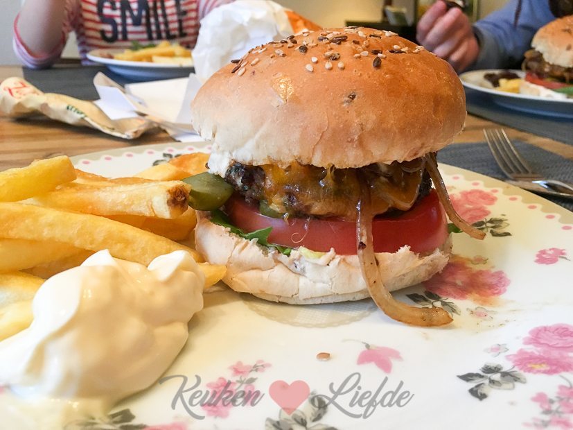 Ik maak broodje hamburger voor het avondeten. We halen er een zakje frietjes bij.