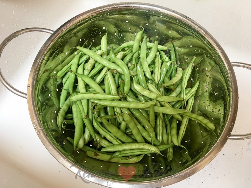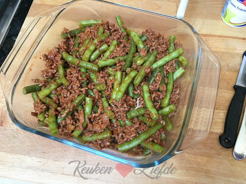 We hebben weer verse sperziebonen uit de tuin van Johan zijn oma gekregen. Voor het avondeten maak ik een ovenschotel met gehakt, sperziebonen en aardappelpuree.
