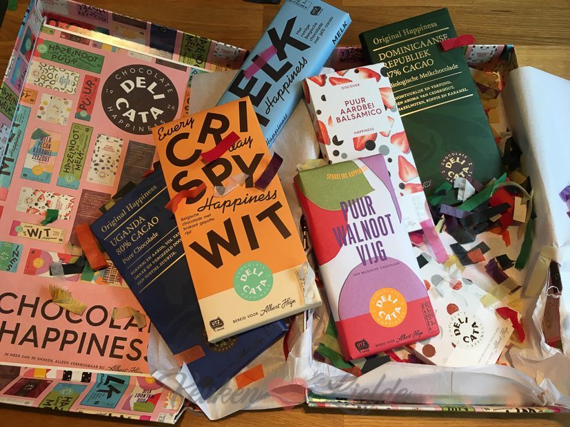 Foodpost! Ik krijg een doos vol chocolate happiness van Delicata, verkrijgbaar bij AH. De melk stroopwafel, crispy wit en puur waloot vijg zijn onze favorieten.