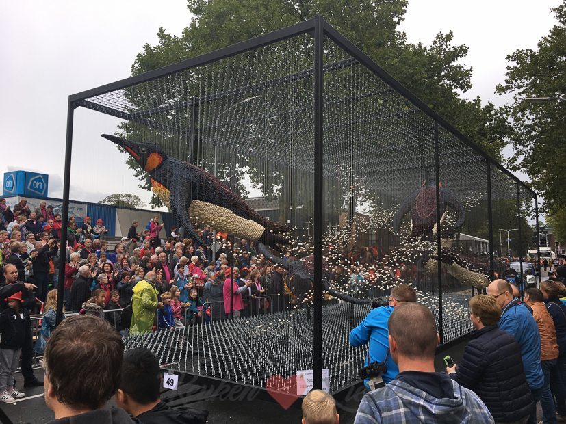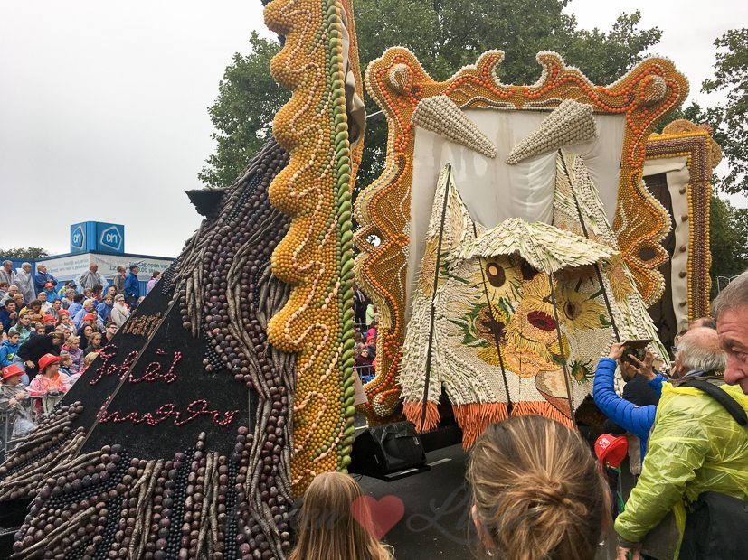 We gaan even kijken bij het fruitcorso. Het blijft toch een bijzonder spektakel om te zien, al die met groente en fruit beplakte praalwagens die voorbij komen rijden. De een nog spectaculairder dan de ander.