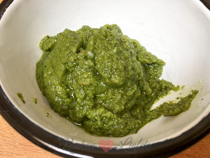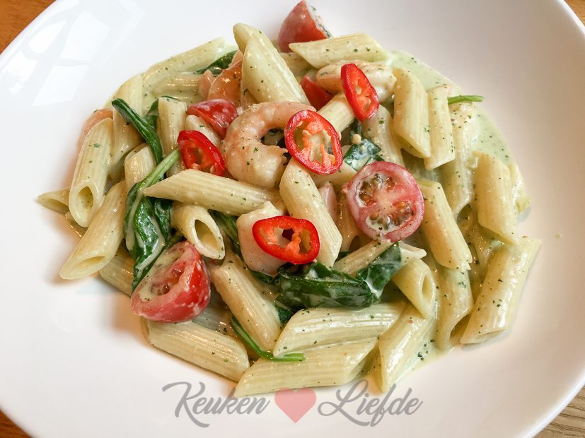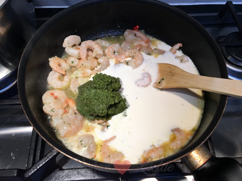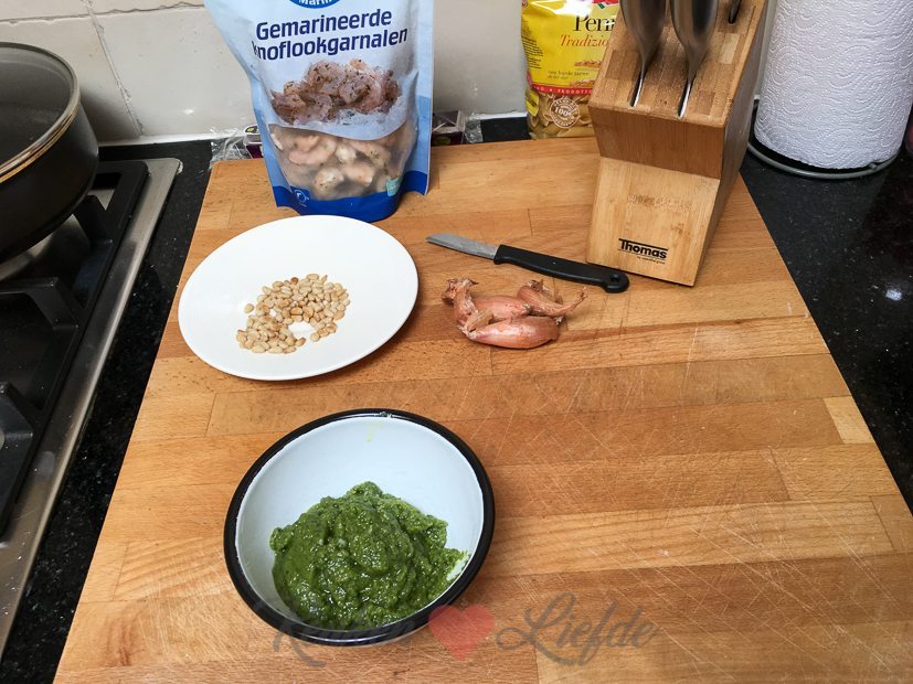 Mijn basilicumplantje buiten begint een beetje op zijn eind te raken dus ik besluit de laatste mooie blaadjes te plukken en er pesto van te maken. Daar hoort natuurlijk een lekker gerecht bij! Ik maak pasta met garnalen in pestoroomsaus. Mijn favoriete pastagerecht!