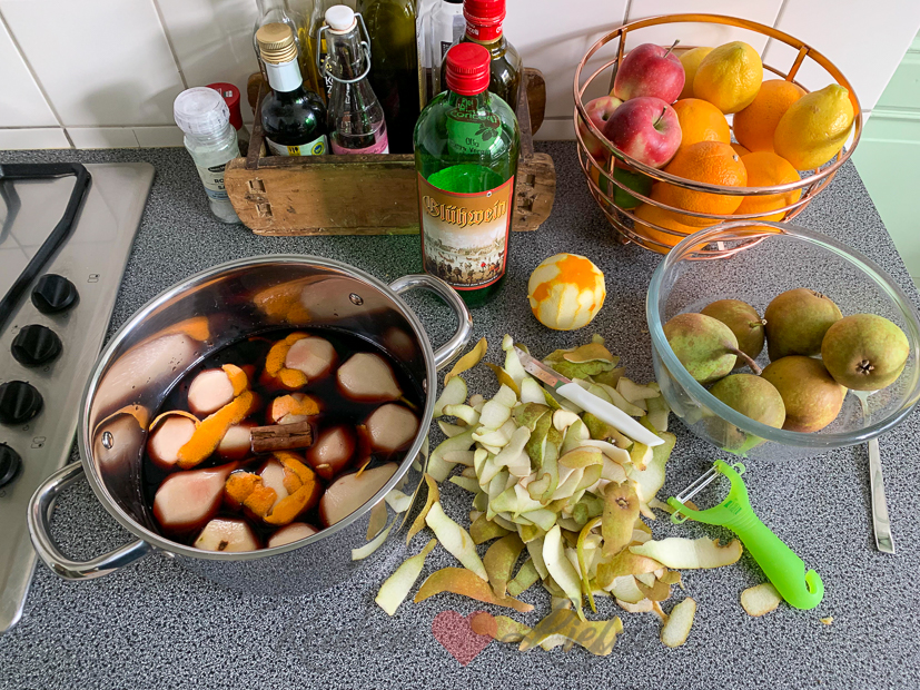 Van de buurman had ik mooie stoofperen gekregen en besluit daar ’s ochtends direct mee aan de slag te gaan. Schillen en zachtjes laten koken in een flesje Glühwein met een paar schepjes suiker, wat sinaasappelschillen en een kaneelstokje.