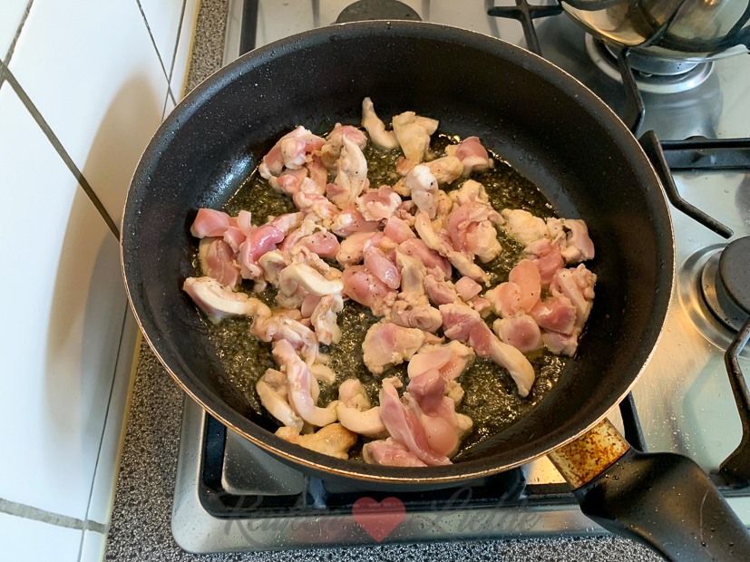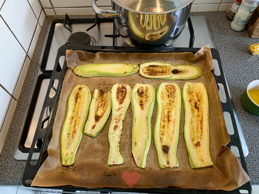 Als we thuiskomen duik ik de keuken in om eten te koken. Ik maak risotto met kippendijen en gegrilde courgette uit de moestuin.