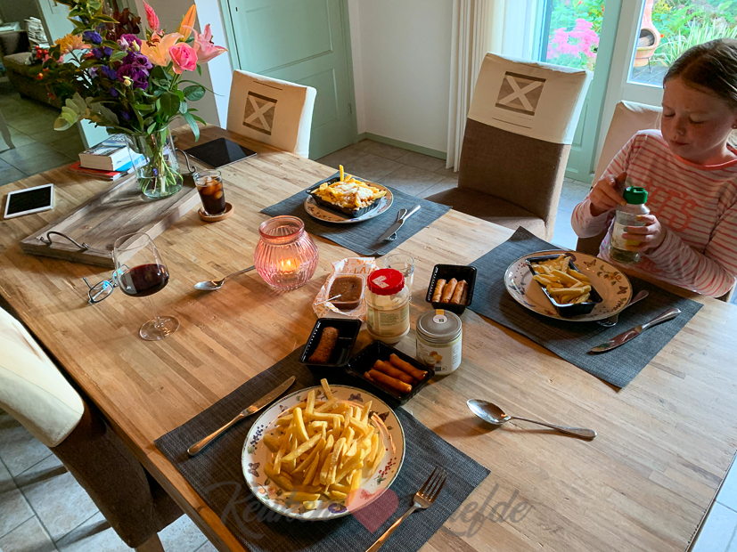 Aan het eind van de middag brengen mijn schoonouders Ella-Marie weer thuis en drinken we buiten nog een drankje. Als avondeten komen er frietjes en snacks uit de Airfryer op tafel die nog in de diepvries liggen.