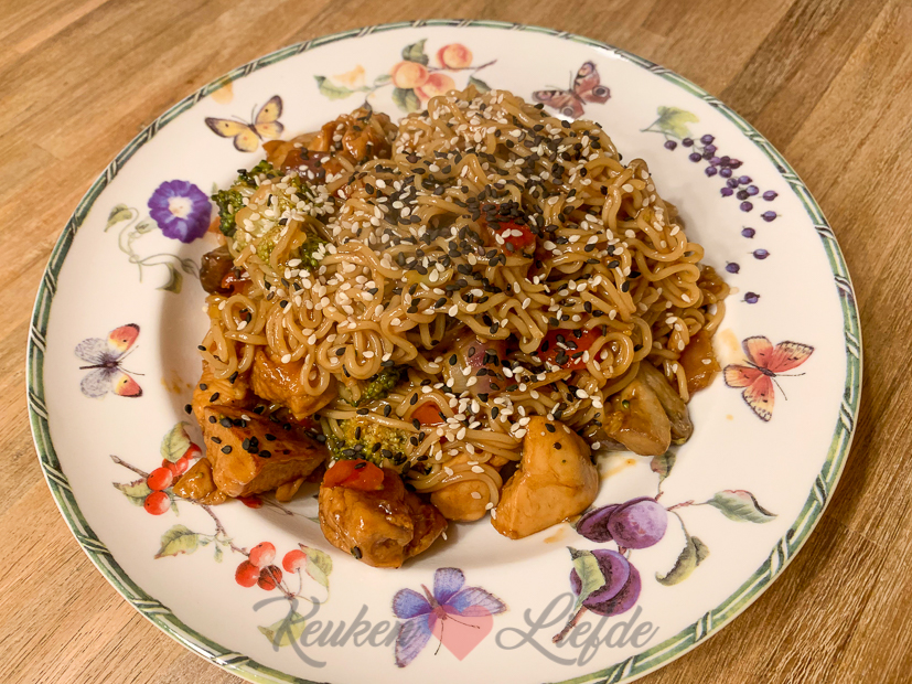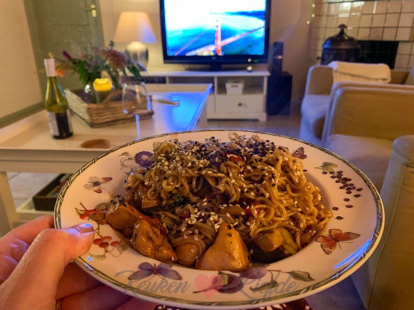 Uiteindelijk wordt het frisser en gaan we naar binnen. Wat gaan we eten? We hebben allebei weinig zin om lang in de keuken te staan dus gaan we voor een snel wokgerecht met kip, roerbakgroenten, teriyakisaus en noedels. Binnen 15 minuten zitten we met het bord op de schoot op de bank voor de tv. Avond!