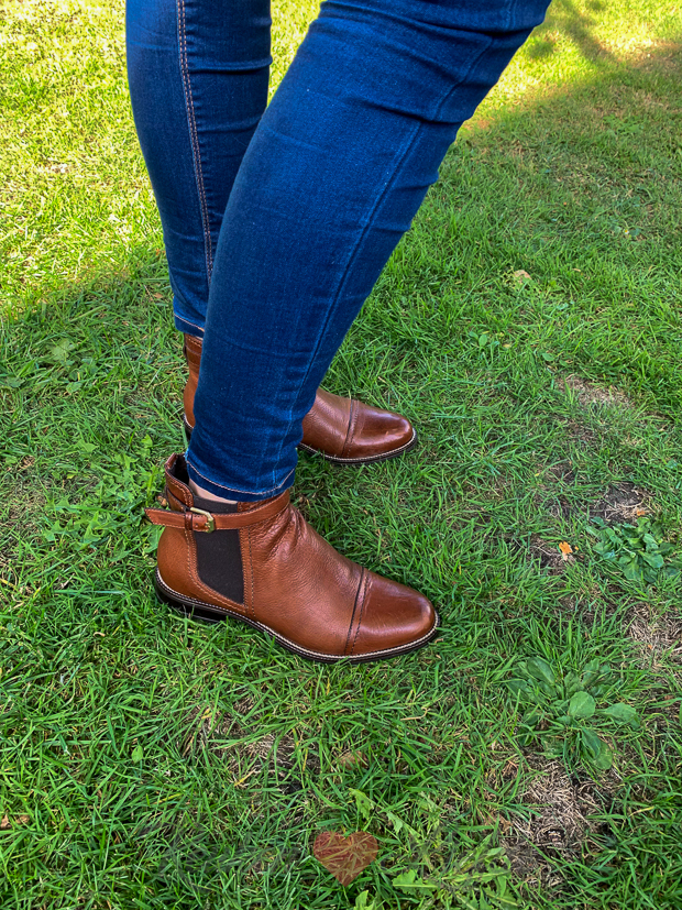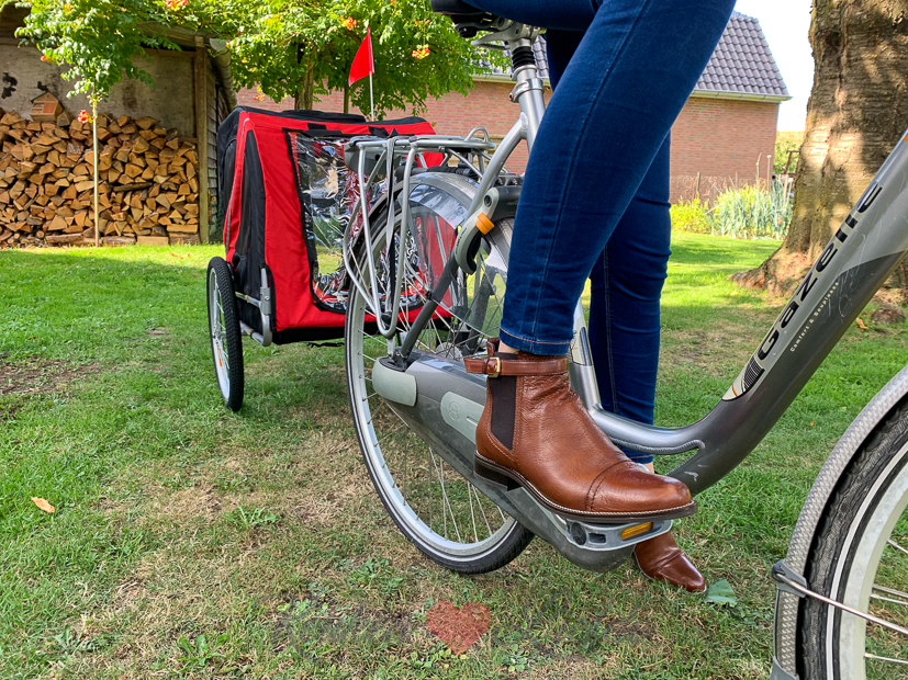 De kussens van de loungeset gaan de zolder op en de loungeset gaat de schuur in. Ook zet Johan de hondenfietskar in elkaar die we gekocht hebben. Zo kunnen we de hond straks meenemen als we (grote stukken) gaan fietsen. Om de kar even uit te proberen lokken we Puk de kater in de kar en fiets ik een rondje door de tuin. Puk vind het zo leuk dat hij nog een rondje wil! 😉 Ik show gelijk mijn nieuwe chelsea boots aan Johan. Zoals ik eerder in het kijkje in de keuken weleens vertelde, mag ik voor een samenwerking met Manfield en Sascha regelmatig een paar nieuwe schoenen uitzoeken. Lucky me! Ik shop mijn schoenen tegenwoordig dus alleen nog maar online en dat is echt heel fijn! Ik weet inmiddels aardig goed in te schatten hoe een schoen valt en welke maat ik moet bestellen, dus meestal hoef ik niets terug te sturen. En mocht dat toch gebeuren, dan is retourneren heel makkelijk. Ik twijfelde dit keer heel erg tussen comfy loafers van Annic, enkellaarsjes met hak of classy chelsea boots. Het werden dus de laatste. De mooie cognac kleur past bijna overal bij. Je kunt ze dragen onder een spijkerbroek, maar ze staan ook heel leuk onder een rok of jurk. Hoe zou jij ze dragen? Ik ben ben niet zo’n fashionista dus sta open voor tips! 🙂