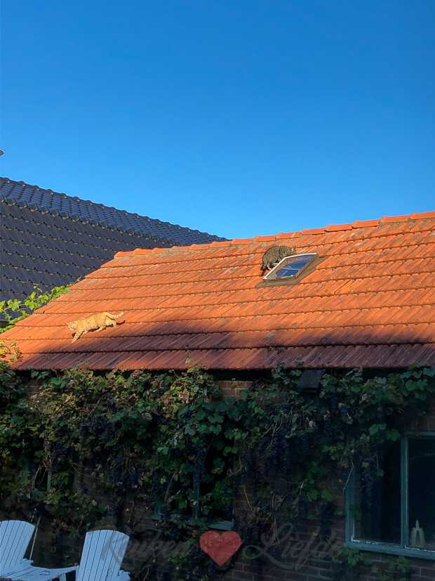 Ken je onze huis-acrobaten Puk en Marie al? Wij geven ze kost en inwoning in ruil voor kunstjes. Hier oefenen ze ‘gevaarlijke capriolen’ op het dak van de schuur. Als dat maar goed gaat…