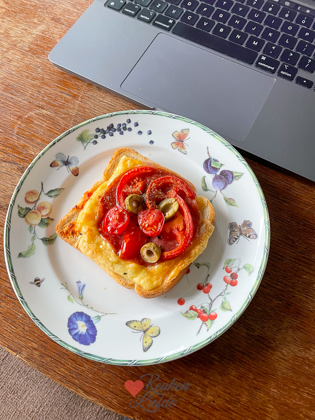 We eten ’s avonds lekker en simpel: belegd naanbrood uit de oven met een kom courgettesoep erbij.