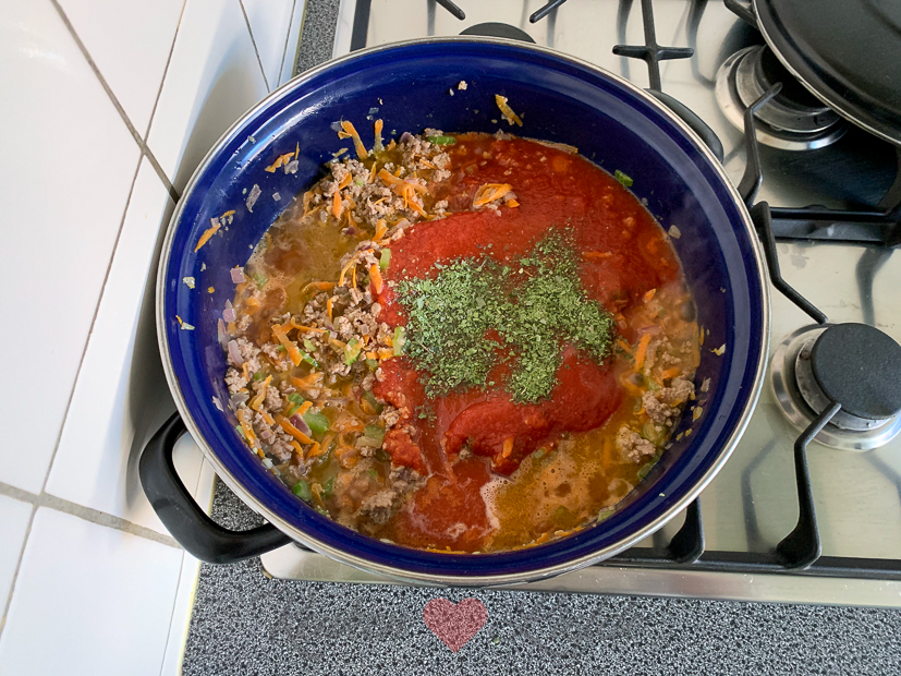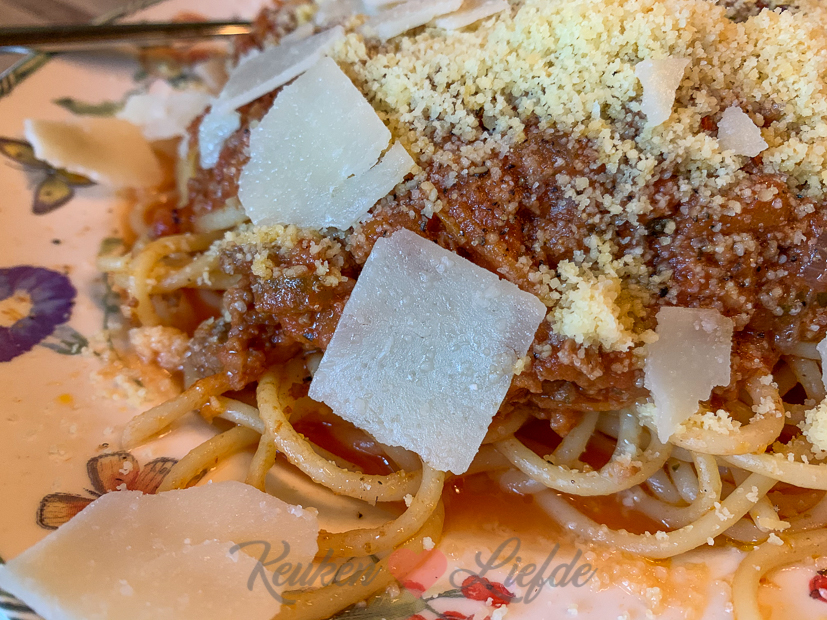 ’s Middags maak ik een grote pan bolognesesaus en laat die op laag vuur lekker lang pruttelen, net zoals stoofvlees. Vanavond eten we spaghetti bolognese!