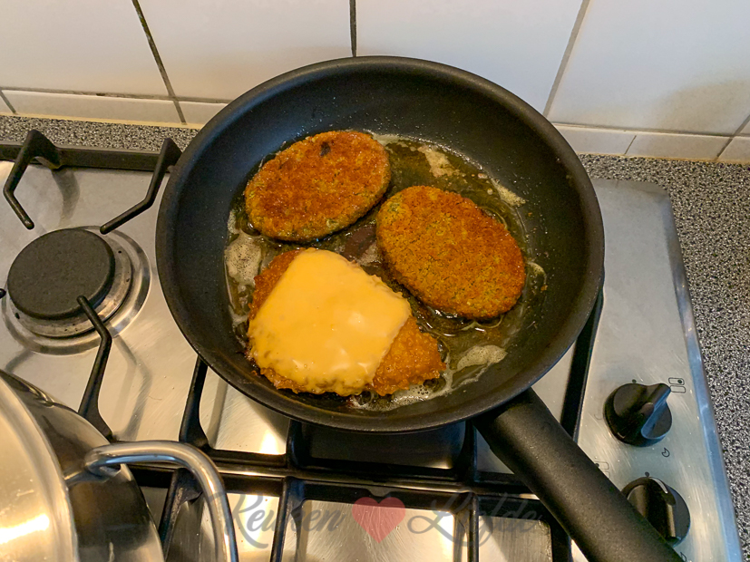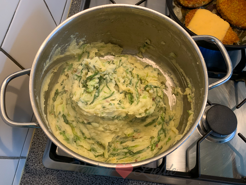 Ik heb nog geen idee wat we ’s avonds moeten eten, maar als ik tijdens het boodschappen doen een verse krop andijvie zie liggen weet ik het: andijviestamppot met uitgebakken spekjes! Wij eten niet zo vaak stamppot en in de zomer al helemaal niet, dus hier heb ik nu echt zin in. Omdat alleen andijviestamppot een beetje kaal is, haal ik uit de diepvries twee groenteburgers voor Johan en mij en een kipschnitzel voor Ella. Op de kipschnitzel van Ella gaat een plakje smelt cheddar.