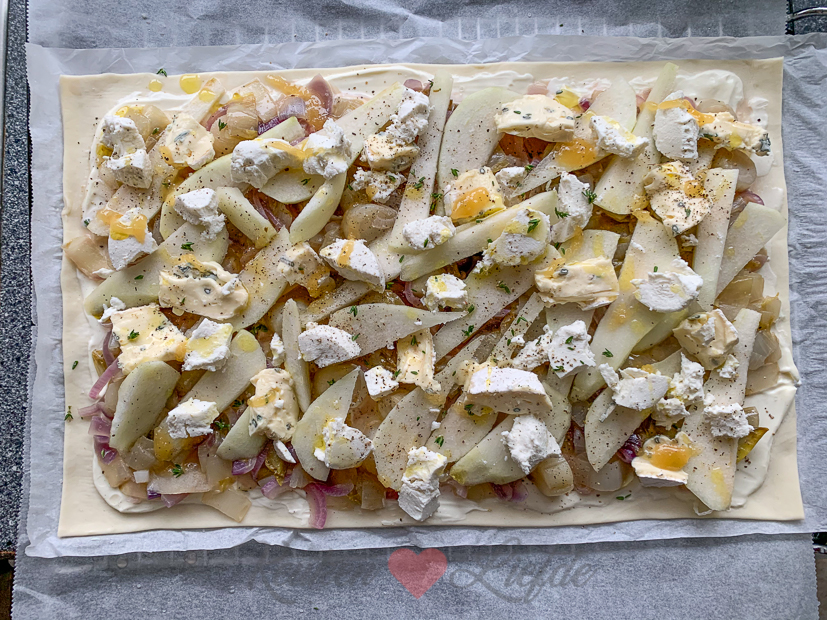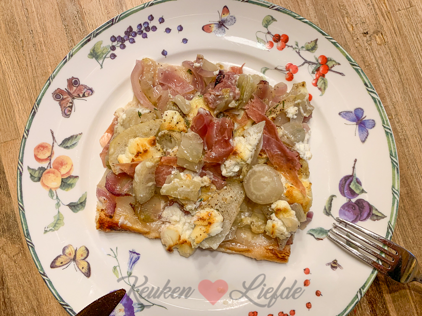 ’s Avonds eten we een lekkere bladerdeegplaattaart met gekarameliseerde witlof, zoete peer en blauwe kaas. Dit recept. Zó lekker! We hadden ook nog wat geitenkaas liggen dus die ging er ook op. De parmaham doen we er pas na het bakken op.