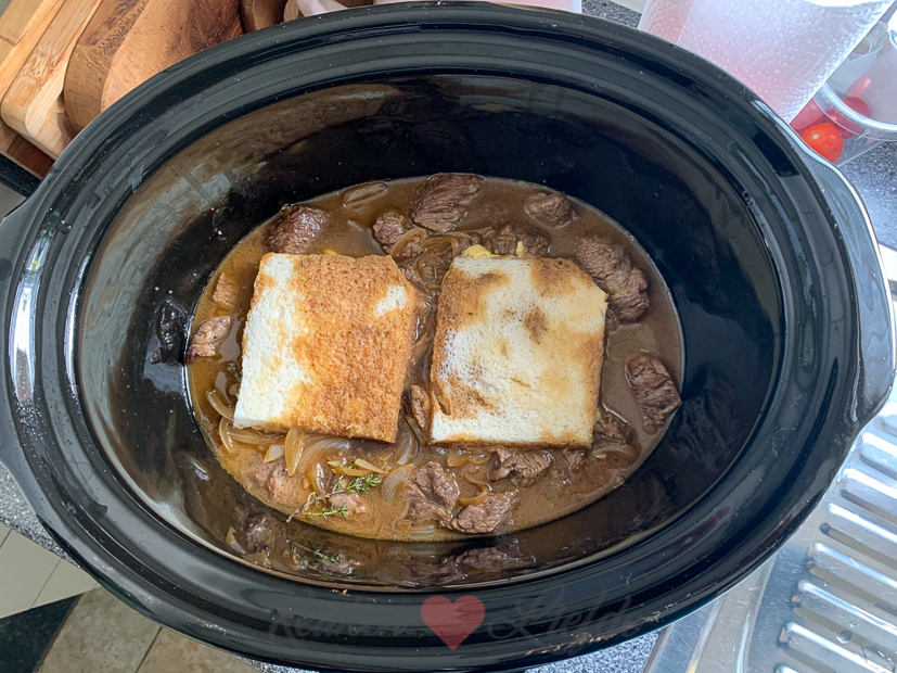 Vanavond eten we Belgisch stoofvlees. Dit recept maar vandaag maak ik het in de slowcooker. Ik maak het ’s ochtends al zodat ik zeker weet dat het vanavond zacht is. Ik bak eerst het vlees in de pan en schep het in de slowcooker. Dan in het bakvet de uien en knoflook bakken met een flinke schep suiker om te karameliseren. Takje tijm, 2/3 flesje herfstbok en 2/3 pot runderfond erbij en op hoog vuur wat laten inkoken. Over het vlees gieten in de slowcooker. Dan twee sneetjes witbrood met mosterd erbovenop en sudderen maar.