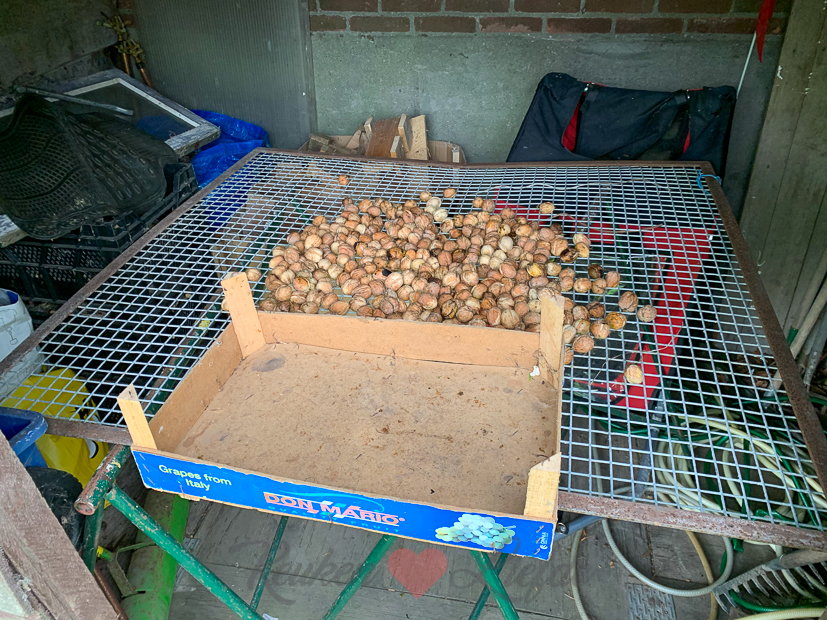 - De eerste walnoten liggen voor te drogen. Daarna gaan ze naar binnen.