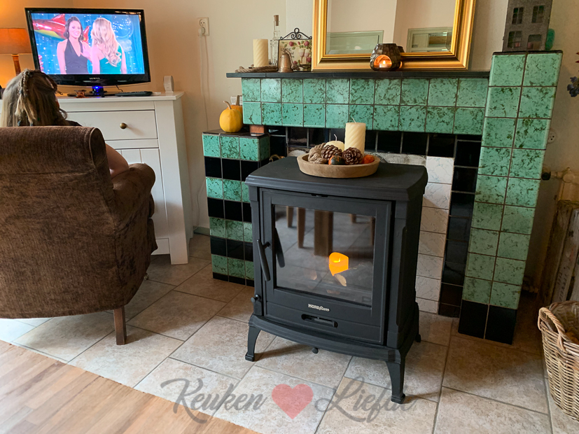 Daarna gaan we naar binnen om ons om te kleden en schuiven we aan tafel met een boekje, een hapje en een drankje. Normaal zouden we nu de openhaard aansteken, maar omdat die nog niet aangesloten is zetten we er een nepkaarsje in met wat houtblokken. Niet de warmte, wel de gezelligheid!