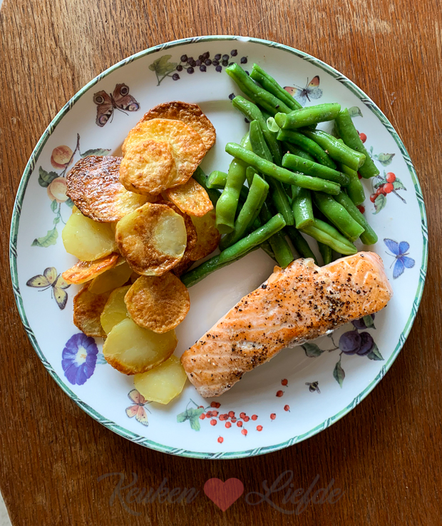 - Aardappeltjes uit de oven, gekookte sperziebonen en gebakken zalm
