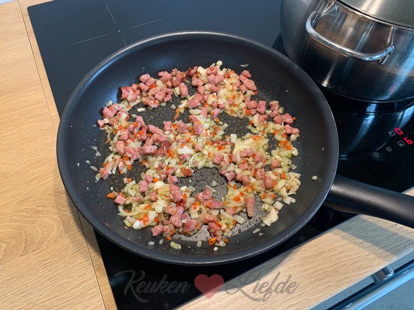- Spekjes uitbakken met ui, knoflook en rode peper