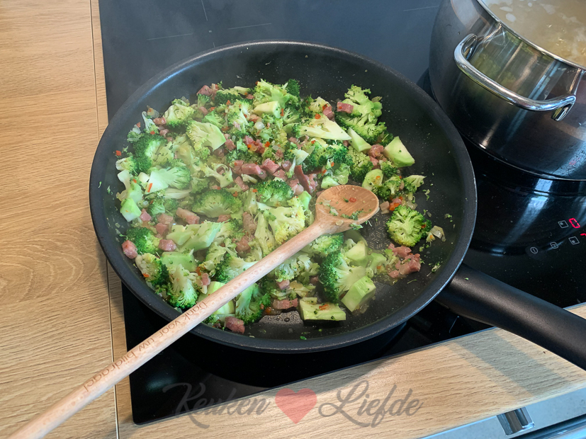 - Scheutje pastakookvocht en bouillonblokje erbij om broccoli iets te garen, dan room en handje parmezaan erbij en laten inkoken tot sausdikte