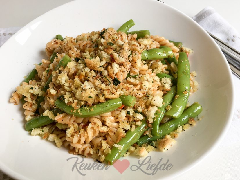 We hebben weer een zak vol sperziebonen gekregen van Johan zijn oma. Heerlijk! Ik maak een pasta pesto met de gegrilde groente pesto van Saclà (die is zó lekker!), sperziebonen en krokant knoflook-broodkruim als topping. Voor 2 à 3 personen: 200 g pasta en 200 g sperziebonen in dezelfde pan tegelijk beetgaar koken. Afgieten en kopje kookvocht opvangen. Terug in de pan met wat kookvocht, inhoud potje pesto, wat olijfolie en op smaak brengen met zout en peper. Bestrooien met krokant broodkruim: 2 sneetjes (oud) witbrood, 1 teen knoflook en takjes peterselie in hakmolen fijnmalen en met olijfolie in koekenpan goudbruin bakken. Eet smakelijk!