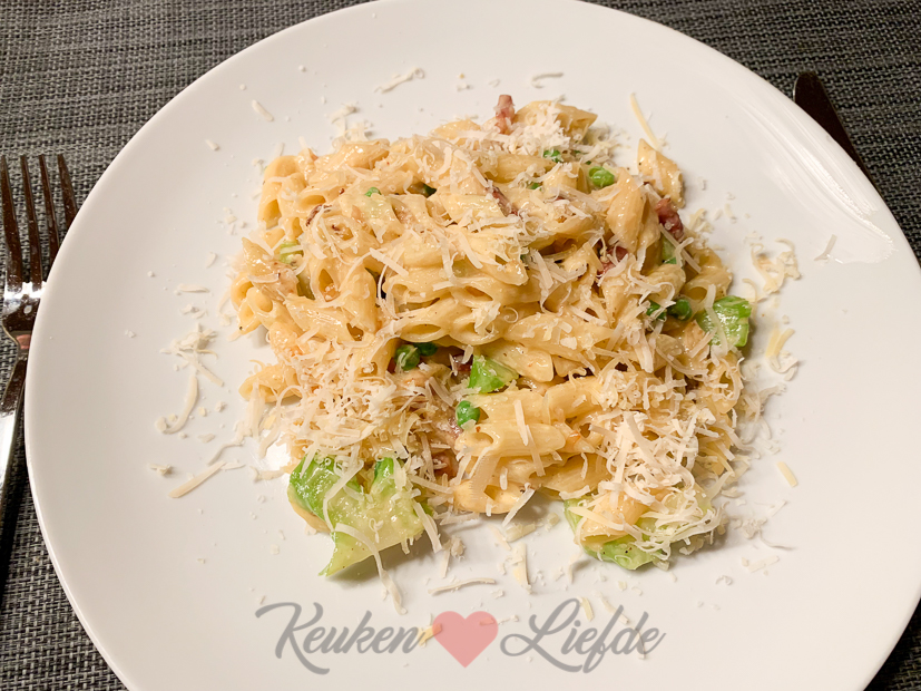 Na twee dagen weekend heb ik op maandag altijd weer zin om aan het werk te gaan. Nu ik dit typ vind ik dat gek klinken want toen ik nog voor een baas werkte was maandag de dag dat ik het minst gemotiveerd was. Dat is nu wel anders! Het klinkt misschien gek maar nu ik eigen baas ben vind ik de maandag een heerlijke werkdag waarop ik altijd veel gedaan krijg. Voor ik het weet is het half drie ’s middags en is het tijd om dochterlief op te halen van school en te bedenken wat we gaan eten. Als ik niks op de planning heb staan word het meestal iets makkelijks dat snel op tafel staat. Vandaag is zo’n dag: ik maak pasta carbonara met spek, broccoli en doperwten. De foto is wat minder maar het was echt heel erg lekker. Ik maakte dit basisrecept waar ik extra broccoli en doperwten meekookte met de pasta en een lepeltje roomkaas toevoegde aan het ei- en parmezaanmengsel voor extra romigheid.
