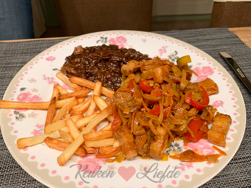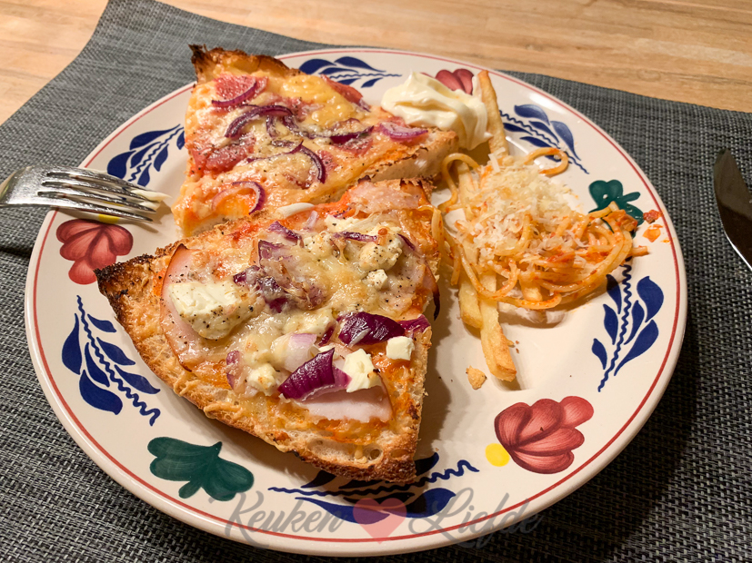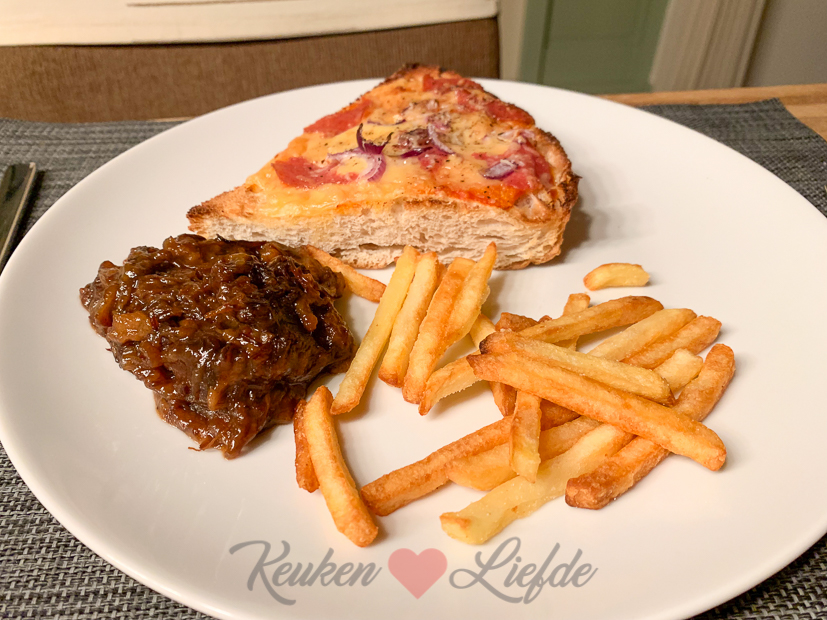 - restje stoofvlees, ovenfrietjes en Turks brood pizza