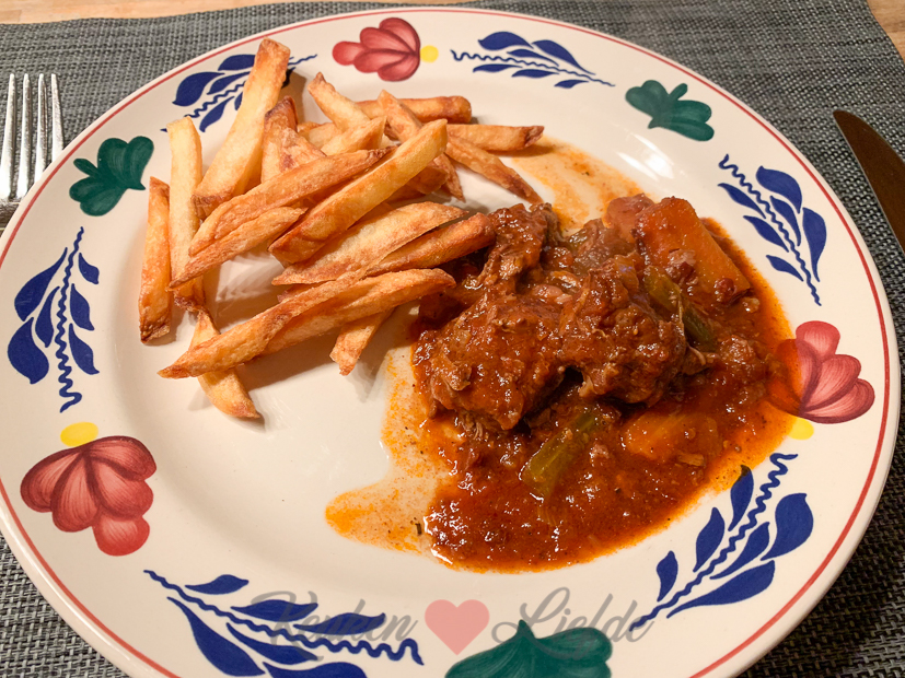 Gisteren had ik bij de slager riblappen gehaald om stoofvlees te maken. Aan het eind van de ochtend gooi ik alle ingrediënten alvast in de slowcooker zodat we het vanavond kunnen eten. Ik maak Italiaans stoofvlees met onder andere pancetta en rode wijn. Een supergeslaagde variant! Het recept ga ik dan ook met je delen. Ook nam ik gisteren bij de groenteboer een zak Frieslander aardappels mee zodat we vanavond zelfgebakken frietjes bij het stoofvlees kunnen eten.