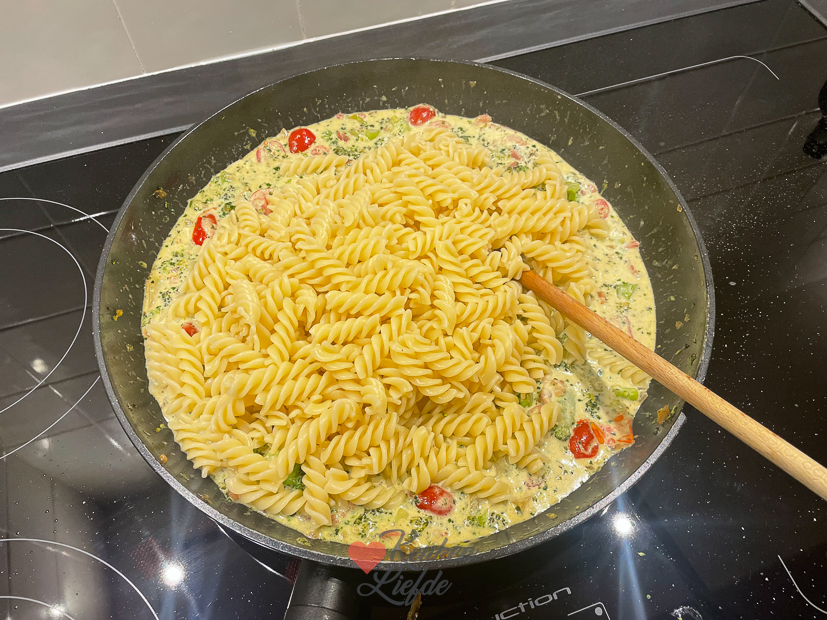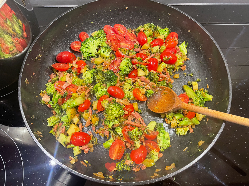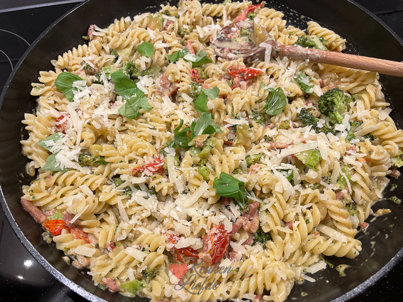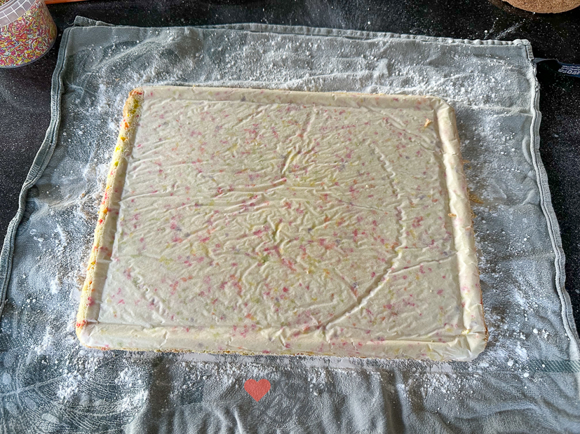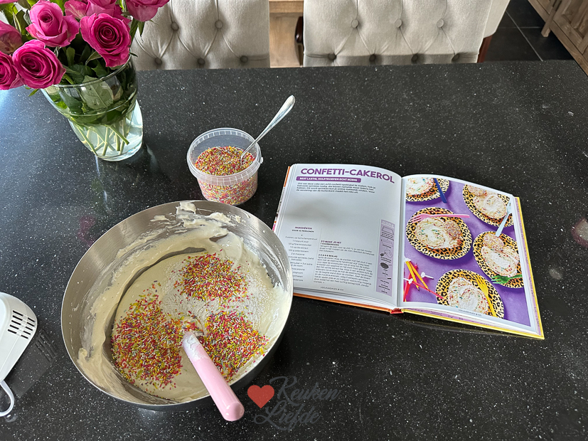 Als iedereen de deur weer uit is werk ik weer een paar uurtjes op kantoor. Halverwege de ochtend ga ik de keuken in om een lekker recept te maken uit het Heel Holland Bakt Kinderbakboek (seizoen 3) die ik vorige week kreeg opgestuurd. Ik had daar een confetti-cakerol in zien staan die me leuk leek om te maken. Het recept ga ik uiteraard met je delen. Hij was heel goed gelukt. Als Ella ’s middags uit school komt kan ze gelijk een stukje proeven. Goedgekeurd hoor! ’s Avonds maak ik een lekkere pasta met bacon, broccoli, tomaatjes en pestoroomsaus. Geen recept van op KL maar gewoon wat room, pesto en parmezaan bij de broccoli (uitje, knoflook, bacon, fijngesneden broccoli bakken, later wat tomaatjes erbij) in de pan (zie foto) en dan de pasta erbij. Was erg lekker.