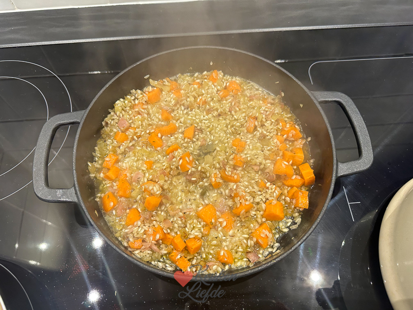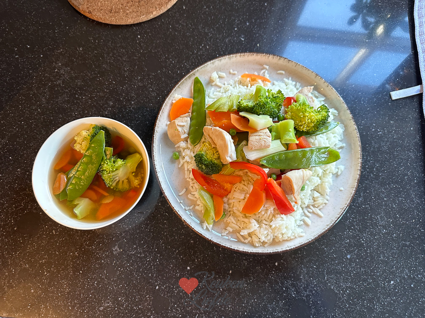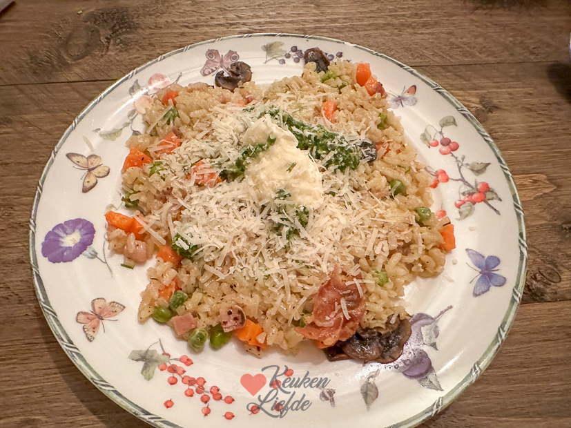 Omdat het ’s ochtends sneeuwt brengt Johan Ella en klasgenootjes naar school. ’s Middags worden ze weer thuisgebracht. Fijn, want ik heb vandaag weer een aantal recepten op de planning staan om te koken. Ik werk eerst een paar uurtjes op kantoor, daarna ga ik de keuken in. Een van de recepten die ik maak is risotto die je misschien al voorbij zag komen in onze IG-stories. Daarna maak ik ragout die een nachtje in de koelkast op moet stijven. Van het weekend ga ik daar bitterballen van draaien en frituren. De bitterballen zijn geïnspireerd op de kaas-bier-bitterballen die Lidl tijdelijk in het assortiment had afgelopen feestdagen. Ik vond ze heerlijk en wilde ze graag zelf maken. Omdat ik nog veel gesneden groenten en gemarineerde kip in de koelkast heb staan (van het stoomrecept dat ik gisteren in het klein maakte voor de website) eten we dat vanavond nog een keer als avondeten. Dit keer gooide ik de hele bak vol met de kip en groenten. We aten er wat gekookte rijst bij. We hebben er met z’n drieën heerlijk van zitten smullen.