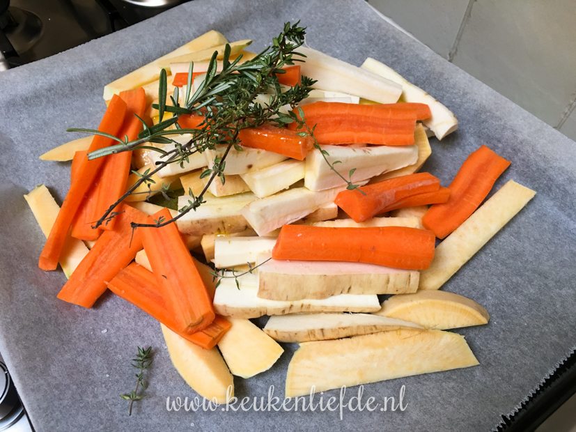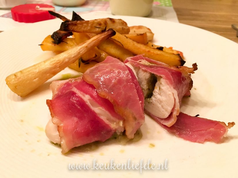 Ik maak (alweer) groentefrietjes — koolraab, pastinaak en wortel — en serveer ze dit keer met pesto en mozzarella gevulde kipfilet omwikkeld met rauwe ham uit de oven. (dit recept alleen dan met mozzarella erbij) Bij de kipfilet in de ovenschaal sprenkel ik wat witte wijn en olijfolie en ik leg er wat gehalveerde cherrytomaatjes en een takje tijm en rozemarijn bij. Zo krijg je een heerlijke jus.