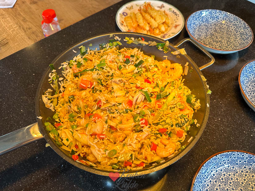 ’s Avonds maakte Johan een lekkere pan met gebakken rijst, roerbakgroenten en zeevruchten, op smaak gebracht met oestersaus, gembersiroop en sojasaus. En wat tempuragarnalen erbij. Was heerlijk.