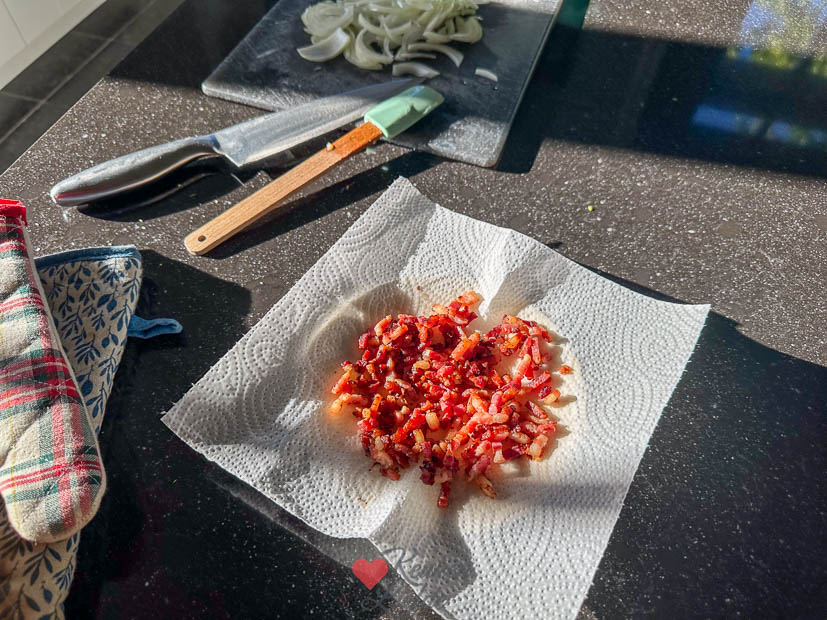 Ik wilde eigenlijk deze spruitjesstamppot maken maar gooide de plannen iets om. Ik maakte een aardappelschotel met spruitjes en gebakken kipschnitzels. De spruitjes husselde ik om met wat olijfolie en zeezout en bakte die op een bakblik ongeveer 17 minuten in een voorverwarmde oven op 200 graden tot ze beetgaar waren. Je hoeft ze niet voor te koken en ook niet te halveren. De spekjes bak je goudbruin in een grote hapjespan en schep die op een bordje met keukenpapier. Dan aardappels bij het achtergebleven spekvet en met scheutje water en deksel op de pan iets zachter smoren. Dan deksel eraf en op hoger vuur water laten verdampen en aardappels goudbruin bakken. Uitje even meebakken met de aardappels. Op het laatste moment de spruitjes en spekjes erbij en even meewarmen.