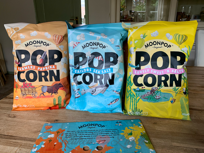 Ik krijg deze leuke doos binnen van Moonpop met daarin hun biologische, vegan én glutenvrije popcorn in 3 smaken: Farmers Paprika, Lovely Sweet’N Salty en Sailor Seasalt. Vooral dochterlief is hier erg blij mee want die is dol op popcorn. Alledrie de smaken zijn goedgekeurd maar de Sailor Seasalt was favoriet hier.