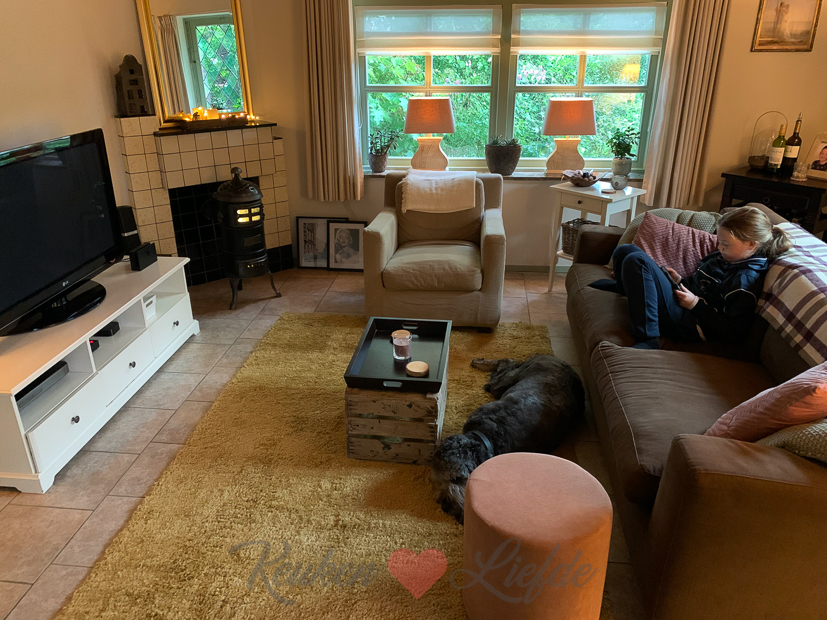 Ik krijg ineens kriebels om het interieur in de woonkamer te veranderen en ga er meteen mee aan de slag. De salontafel en een grote fauteuil worden opgeruimd om meer ruimte te maken. De bank schuif ik voor de tv. Een houten kratje (dat van de opa van Johan is geweest) met een houten dienblad erop doet voorlopig even dienst als salontafel tot ik iets anders vind. Vloerkleed in het midden (niet helemaal de goede kleur helaas, zou ik hem kunnen verven met kalkverf? Wie heeft daar ervaring mee?), nieuwe poef erbij en nog wat andere snuisterijen om het een beetje gezellig te maken. Volgende stap is een andere tv-kast (hout en landelijk) en wijntafeltje op de plek waar nu het witte tafeltje staat. De fauteuil die er nu staat wil ik vervangen door een of twee iets kleinere oorfauteuils. Ik zie het al helemaal voor me! En we willen binnenkort ook een begin maken met het wit schilderen van alle groene deuren en kozijnen in huis om wat meer eenheid en rust te creëren. Genoeg te doen dus! ?