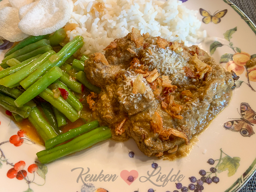 Gisteren tijdens het boodschappen doen zag ik riblappen in de aanbieding liggen en die kon ik niet weerstaan. Terwijl Johan met Ella-Marie ’s ochtends naar de voetbal is, duik ik de keuken in. Omdat ik de laatste keer Belgisch stoofvlees maakte, kies ik dit keer voor rendang met zelfgemaakte boemboe. Inmiddels heb ik al meerdere recepten voor rendang gemaakt om uit te proberen, maar tot nu toe was er altijd wel een punt van verbetering. Dit keer laat ik alle recepten los en maak mijn eigen variant. Ik maak hem in de slowcooker maar je kunt hem ook in de braadpan maken. Dan moet je alleen wat meer vocht toevoegen omdat er dan meer vocht verdampt. Ik bak eerst het vlees aan in de koekenpan en doe het vlees dan in de voorverwarmde slowcooker (stand high op 5 uur). Dan bak ik mijn zelfgemaakte boemboe even aan en voeg de kokosmelk toe. Even verwarmen en dan bij het vlees in de slowcooker samen met wat extra smaakmakers. Deksel op de pan en die slome zijn werk laten doen! ? Omdat stoofvlees de volgende dag altijd nog lekkerder is, eten we vanavond iets anders.