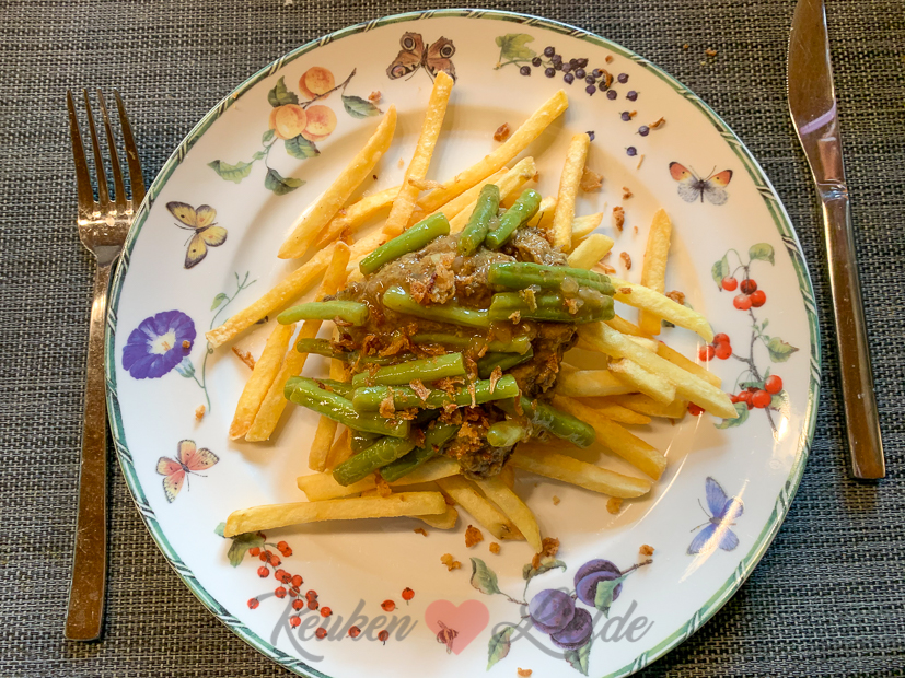 Als we thuiskomen warmen we wat kliekjes op van het eten van gisteren en bakken er nog wat frietjes bij. Frietje rendang met sajoerboontjes it is! ?
