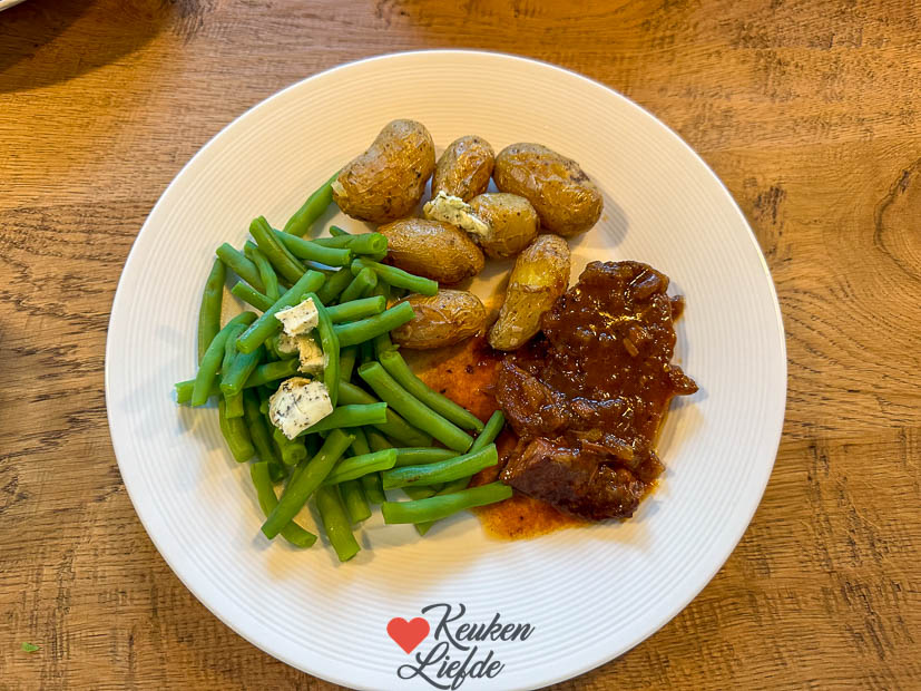 Het weekend was er één zoals altijd. Ella-Marie had zaterdagmiddag een voetbalwedstrijd, Johan was weer iets opgeknapt en ging klussen en ik maakte het huis schoon, deed boodschappen en kookte eten. Zaterdag begin van de middag zette ik de slowcooker aan met sucadelappen voor het avondeten. De sucadelappen bakte ik eerst kort aan met zout en peper in de koekenpan. Daarna bakte ik wat uien zacht en bluste die af met scheutje ketjap manis, lepeltje sojasaus, wat geraspte gember, een lepeltje tomatenpuree, schepje suiker, scheutje azijn en water (alles op gevoel, goed proeven!) erbij tot je een smakelijk sausje hebt. Riplappen en saus in de slowcooker en sudderen maar. Ik bereidde ze op stand low in de slowcooker voor een uurtje of 5 schat ik. Ze waren uiteindelijk boterzacht. Johan bereidde ’s avonds krieltjes erbij op het ei en roosterde wat kippenvleugels als snack. Ik kookte ’s avonds nog wat sperziebonen voor bij de sucadelapjes. Later op de avond kwam er nog een borrelplankje op tafel tijdens de film.