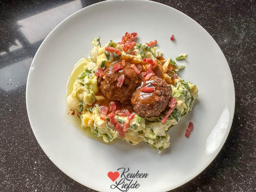 ’s Avonds maak ik andijviestamppot met uitgebakken spekjes, gehaktballen en jus. Door de andijviestamppot roer ik nog zilveruitjes, hardgekookt ei en blokjes kaas. Volgende keer moet ik alleen oude of belegen kaas gebruiken en geen jong belegen kaas. Die heeft niet zoveel smaak in de stamppot.