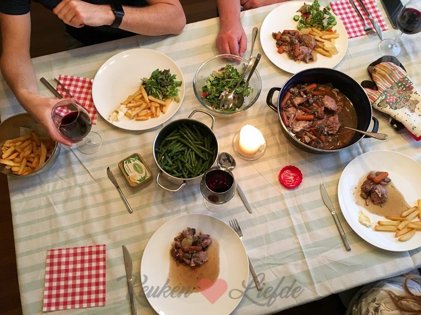 We serveren de coq au vin met zelfgesneden verse friet, gekookte sperziebonen, stokbrood en salade gemaakt door Ella-Marie. Als toetje is er appeltaart met vanilleroomijs en slagroom. Was een topavond.