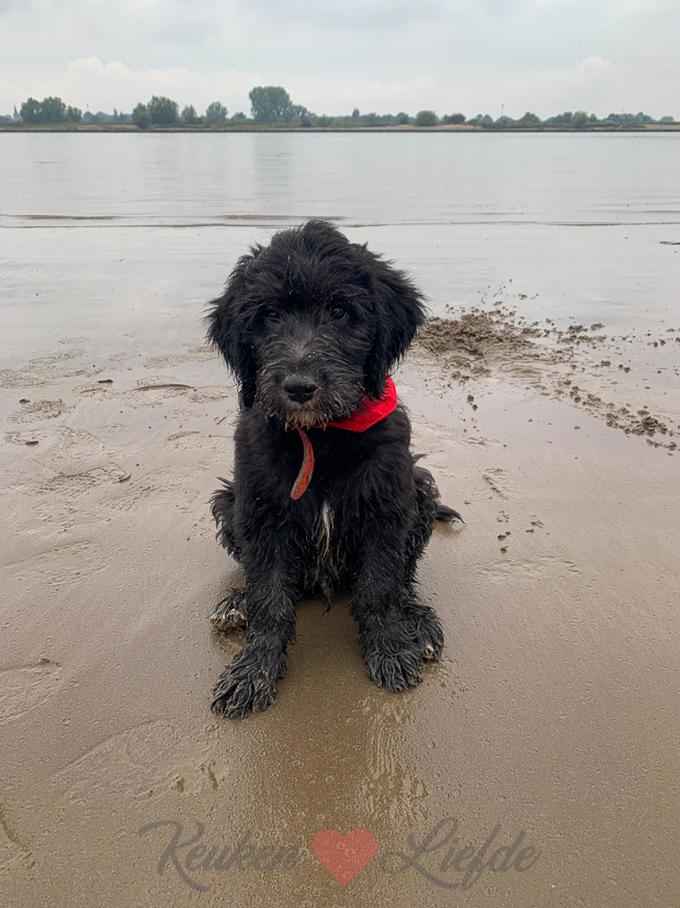 Daarna wandelen Johan en ik met Nacho nog even naar het waalstrandje. Nacho heeft energie voor tien vandaag. Hij graaft, wroet en rolt door het zand als een bezetene, maar poseert met zijn onschuldige puppy pose als ik hem op de foto zet.